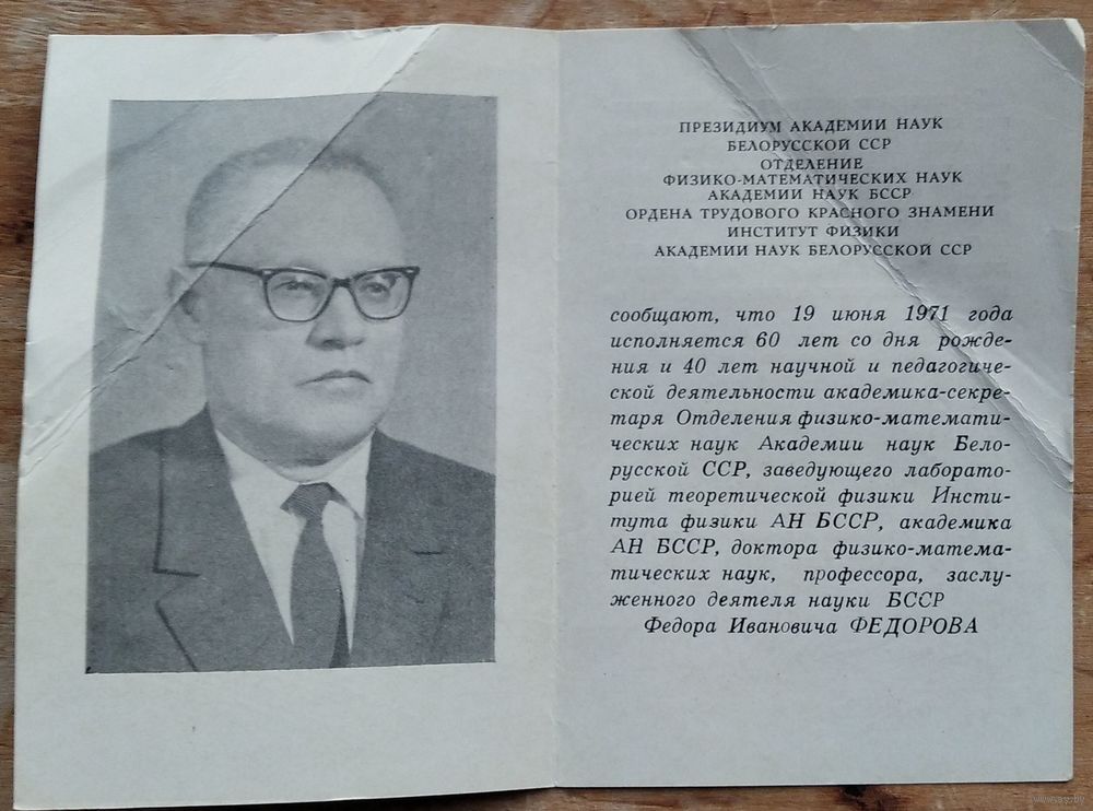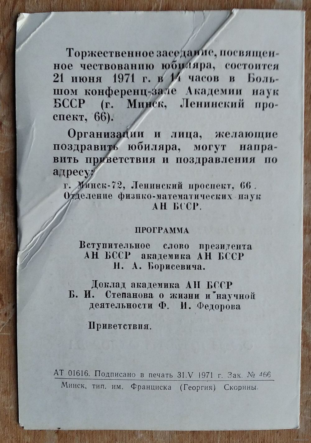 Приглашение на торжественное заседание. 60 лет академику АН БССР. 1971 г.
