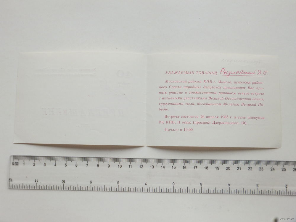 Приглашение на встречу с активными участниками ВОВ Минск 1985