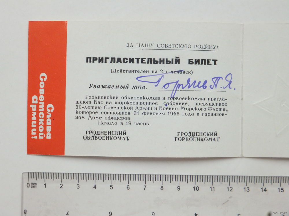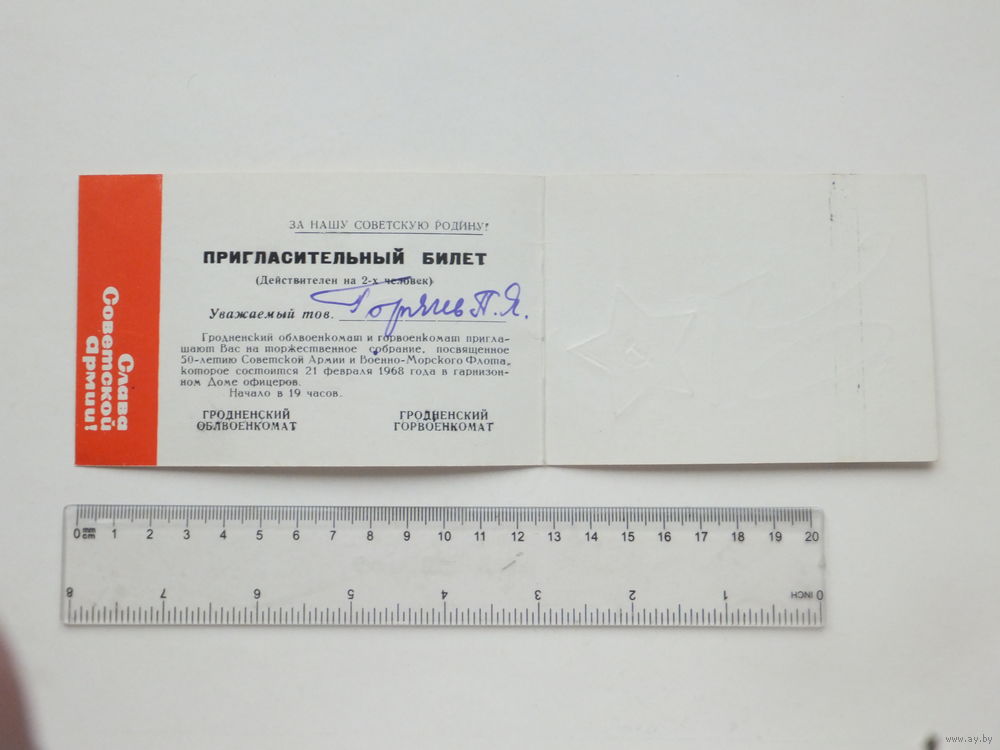 Пригласительный билет Гродно военкомат 1968 г