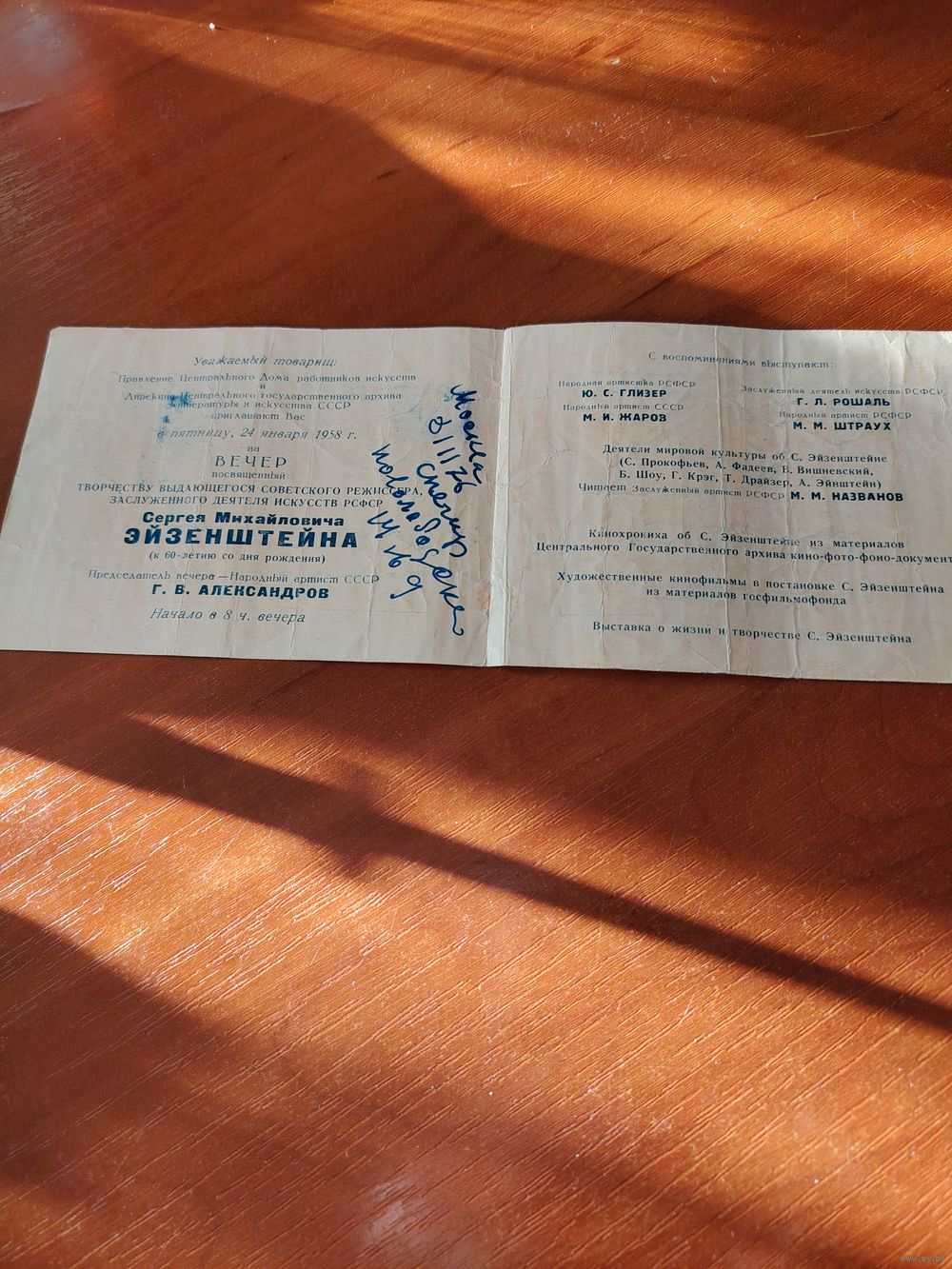 Пригласительный билет. Вечер Сергея Эйзенштейна, 1958 год./Д