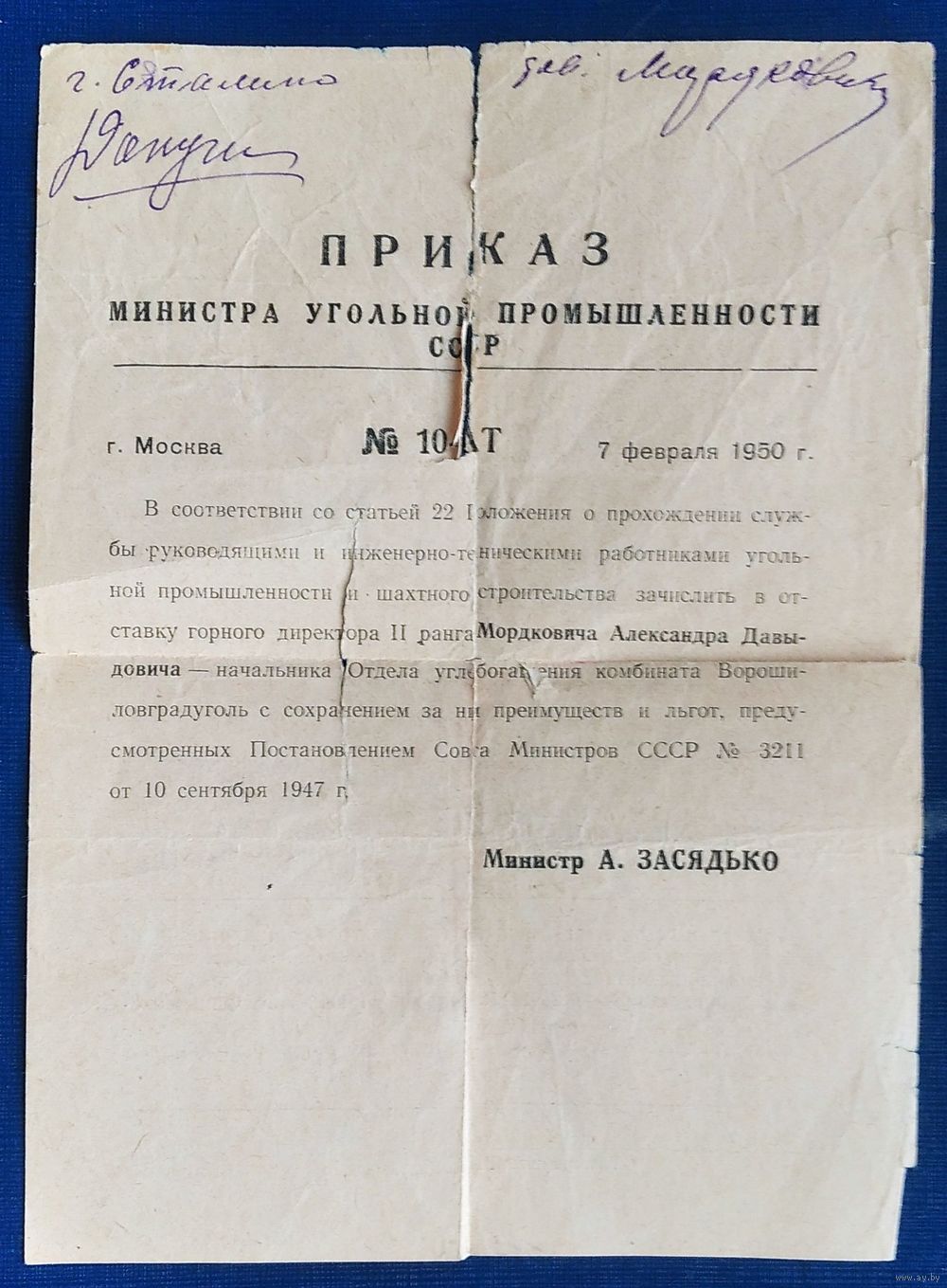 Приказ Министра угольной промышленности СССР. 1950 г.