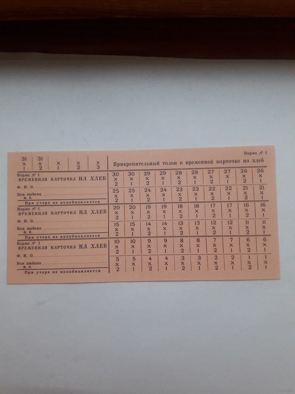 Прикрепительный талон к временной карточке на хлеб Норма 1 ( СССР)