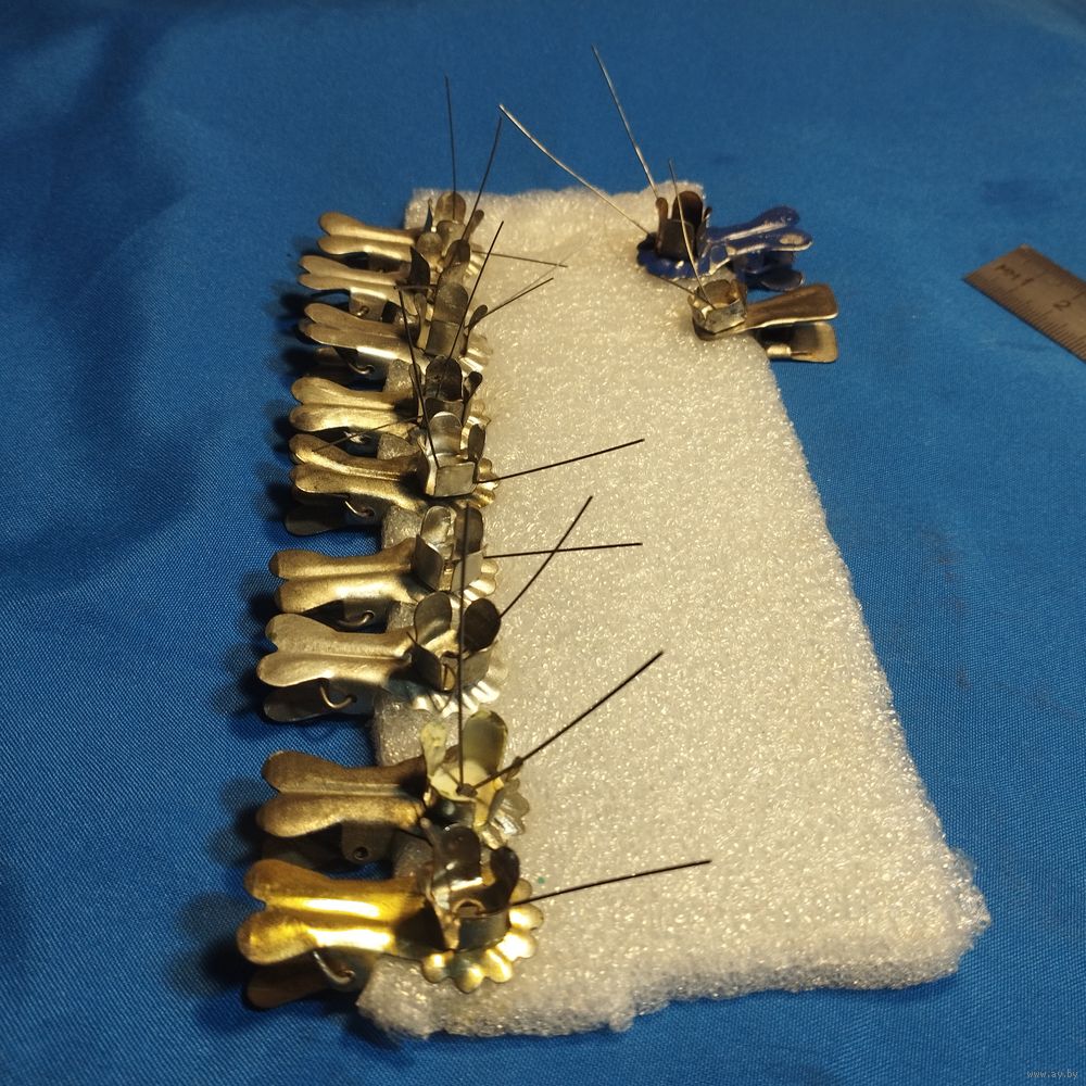 9 прищепок одинаковой формы, длина 3,5 см, диаметр постановочного основания 1 см и одна цветная синего цвета.