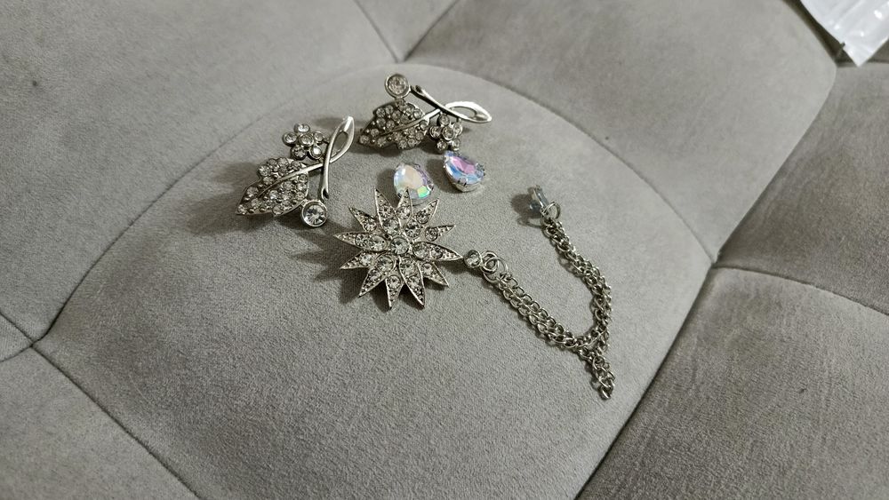 | Цена за весь лот 13р. Фото 2-3 парные листикис цветочками, пробивные - цена 5р. Фото 4-5 "алмазики, покрытие АБ 2 шт цена 5 р. Фото 6-8 цветок пришивной цена 6р. | |