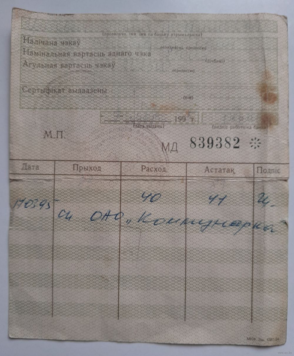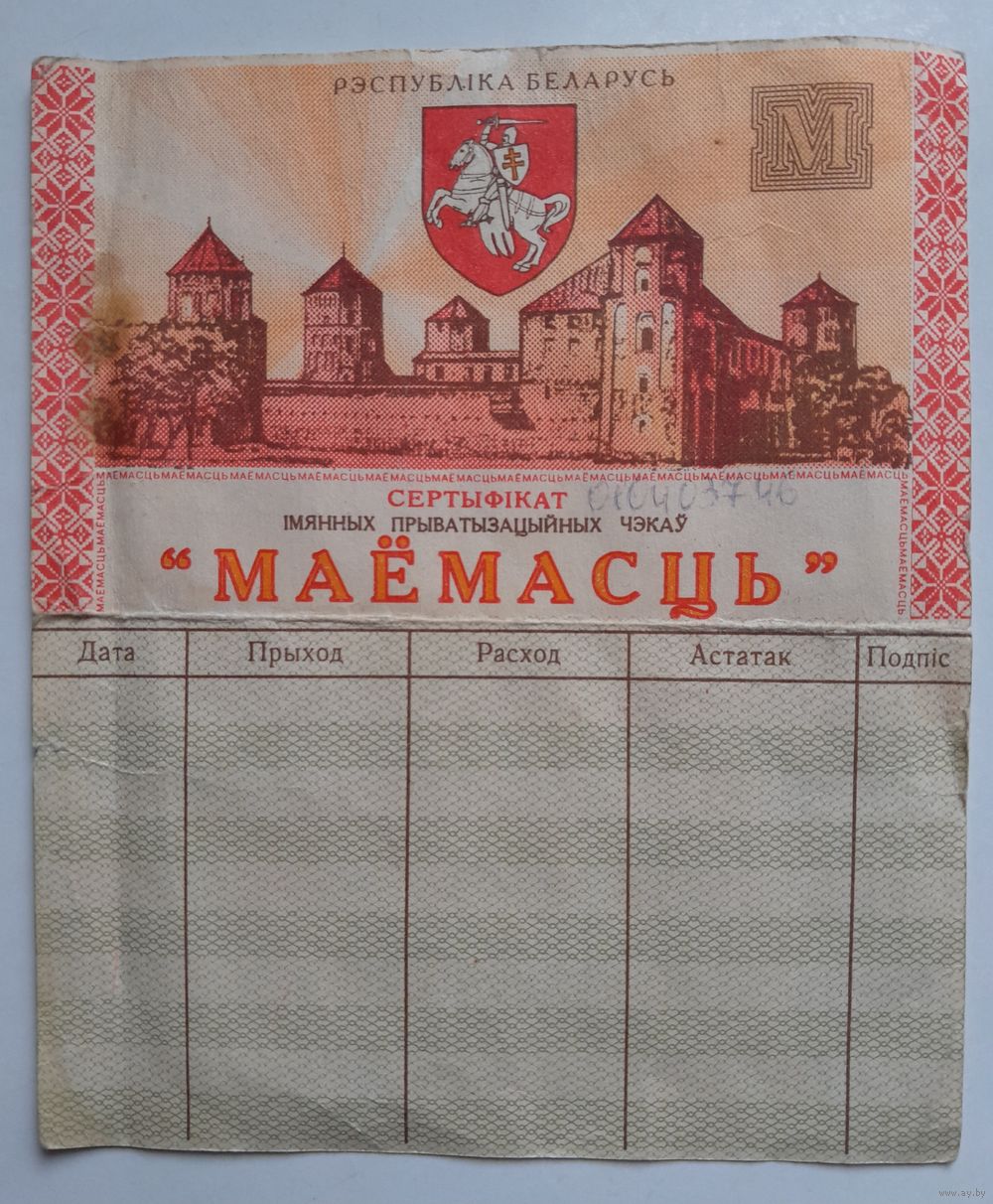 Приватизационный чек "Маёмасць" 1995г. Беларусь. Состояние на фото. Стандартный аукцион без минимальной цены.