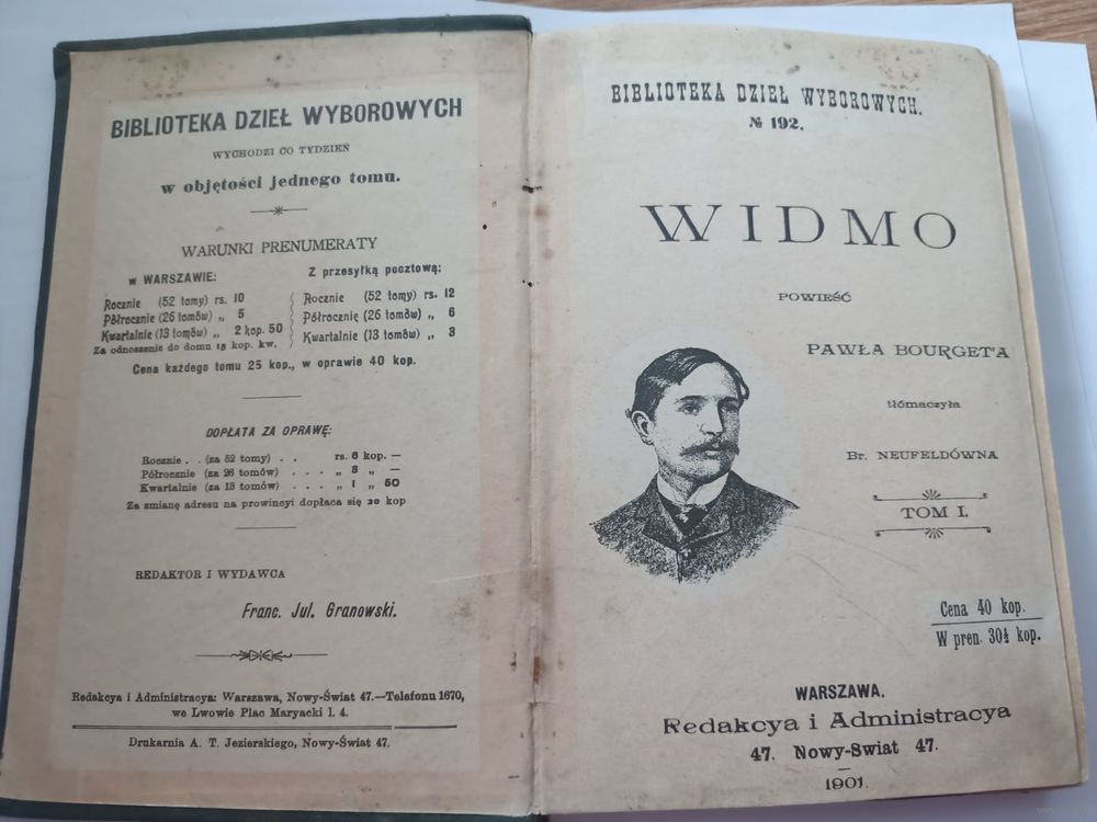 Книга «Widmo» (Призрак) — это польский перевод психологического романа французского писателя Поля Бурже (Paul Bourget) «Le Fantôme», впервые опубликованного в 1901 году