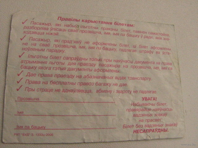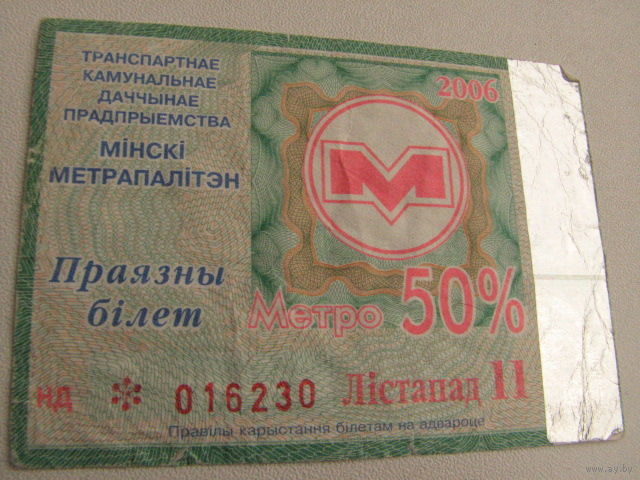 Проездной билет Метро - 2006 год. 11 месяц. Минск (льготный)