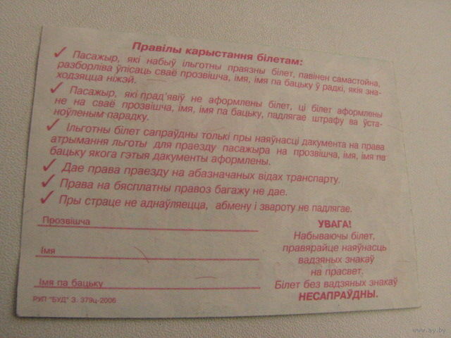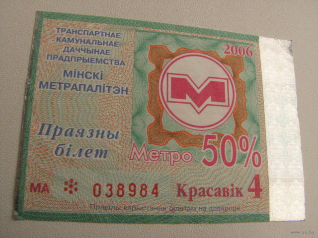 Проездной билет Метро- 2006 год. 4 месяц. Минск (льготный)