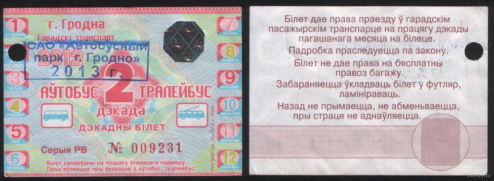 Проездной РБ Гродно 2013.02.2 декада автобус троллейбус все дни с 11 по 20 февраляя РВ009231 РУП БУД з.14ц-2012, т.15000 ТОРГ/ВАША ЦЕНА