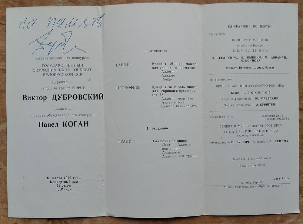 Программа концерта Государственного симфонического оркестра Белорусской ССР. Белорусская филармония. 1979 г. Автограф дирижера.
