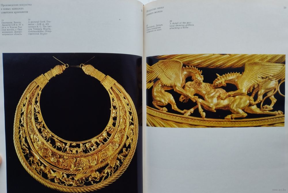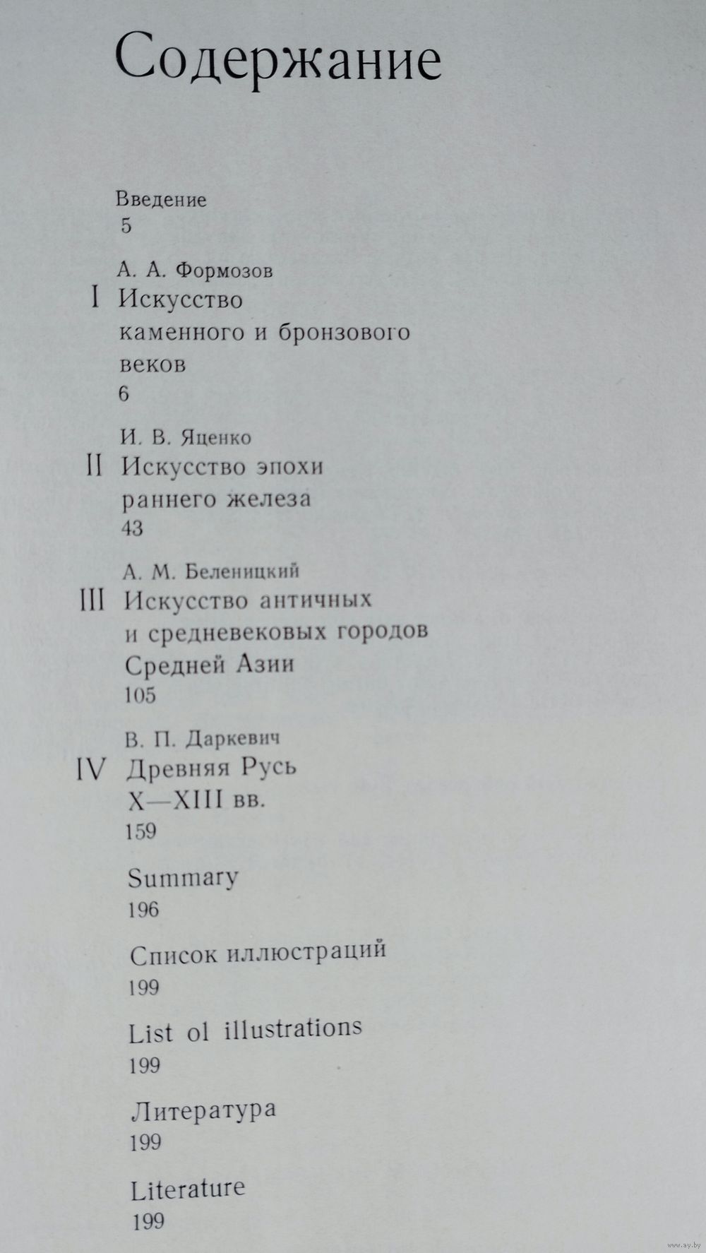 Большой энциклопедический формат. На рус. и англ. яз. Мелованный альбом. Ляссе. Тираж 10000 экз. 214 стр. Коллектив авторов представляет исследование произведений искусства, найденных советскими археологами в различных эпохах, от каменного века до средневековья. Книга охватывает искусство каменного и бронзового веков, эпохи раннего железа, а также искусства античных и средневековых городов Средней Азии и Древней Руси X-XIII вв. Эти находки открывают новые аспекты древних культур, сохраняя при этом свое художественное значение.