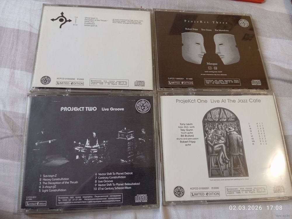 ProjeKct 1-4 ( King Crimson) live 1997-99. 4 CD. Редкие. В хорошем состоянии, без царапин. Bootleg Russia. Больше не переиздавались! Цена за все. Продается только комплектом! Без торга! Возможность отправки Белпочтой, исключительно. Полная предоплата на карту Беларусбанк
