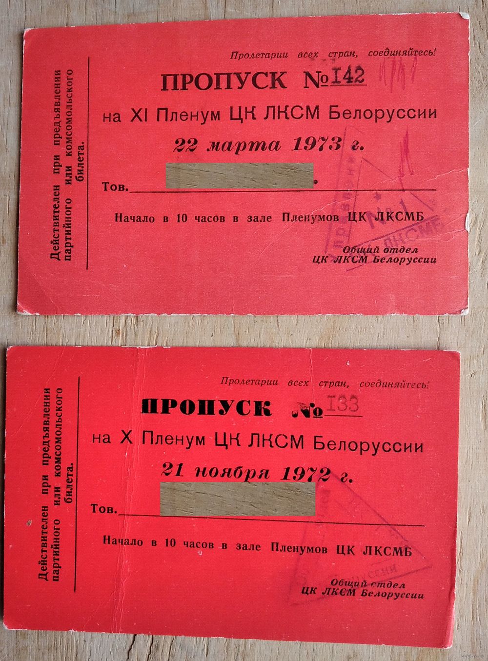 Пропуск на Пленум ЦК ЛКСМ Белоруссии. 2 шт. 1972, 1973 г. Цена за 1.