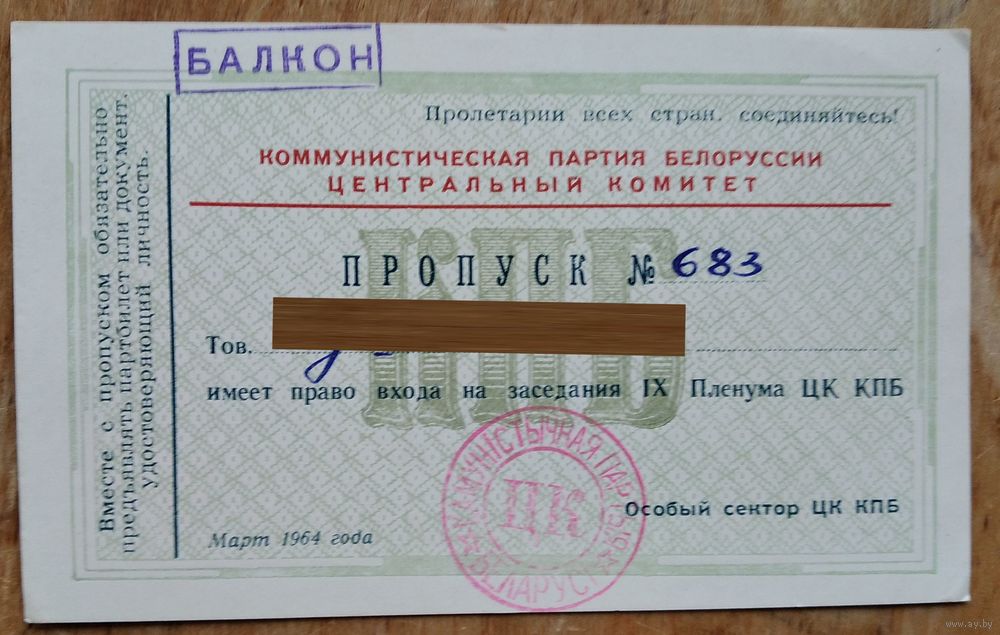 Пропуск на заседания IX Пленума ЦК КПБ. Минск. 1964 г.