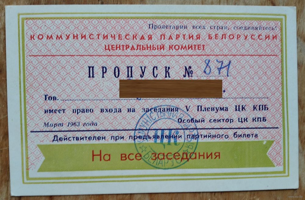 Пропуск на заседания V Пленума ЦК КПБ. Минск. Март 1963 г.