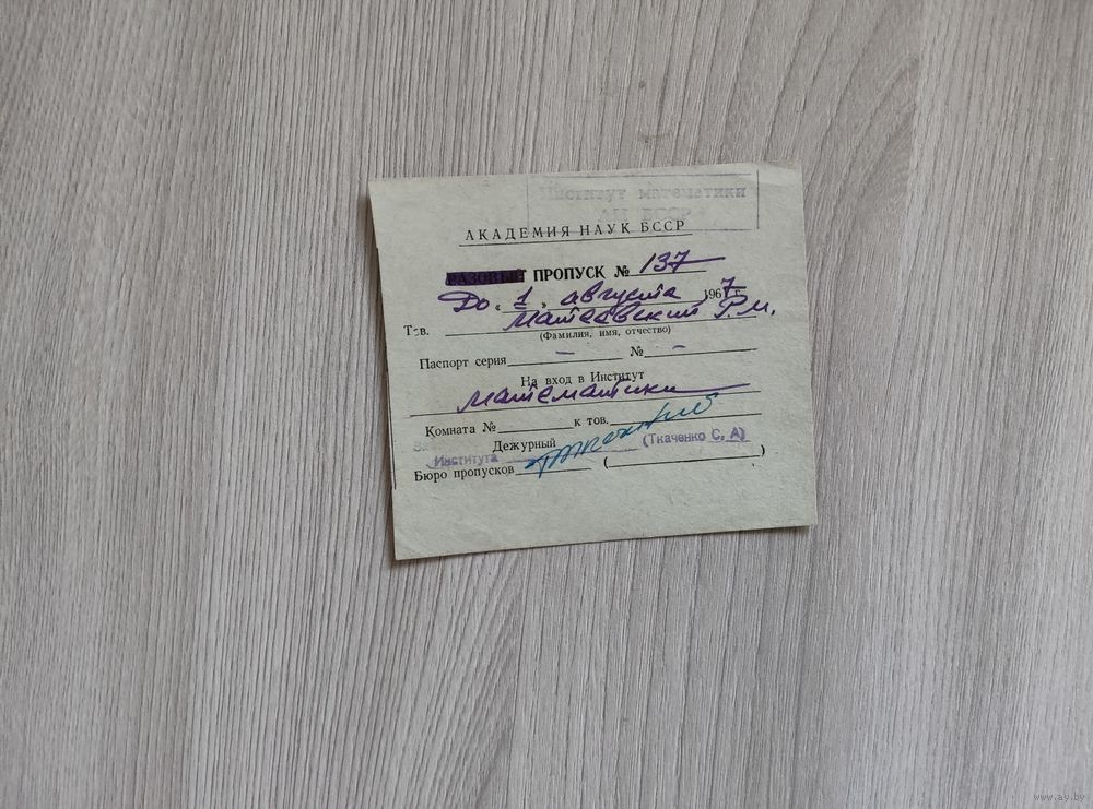 Пропуск в институт математики АН БССР 1967 год.