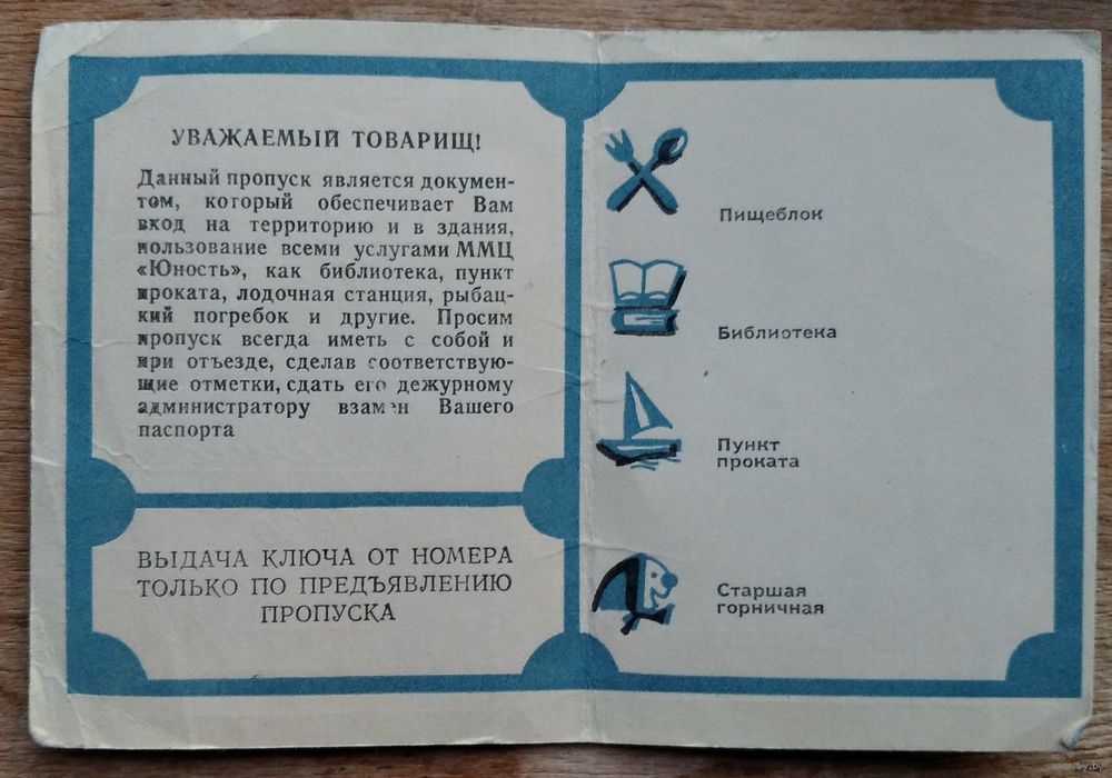 Пропуск в Минский международный молодежный центр "Юность" 1980-е.