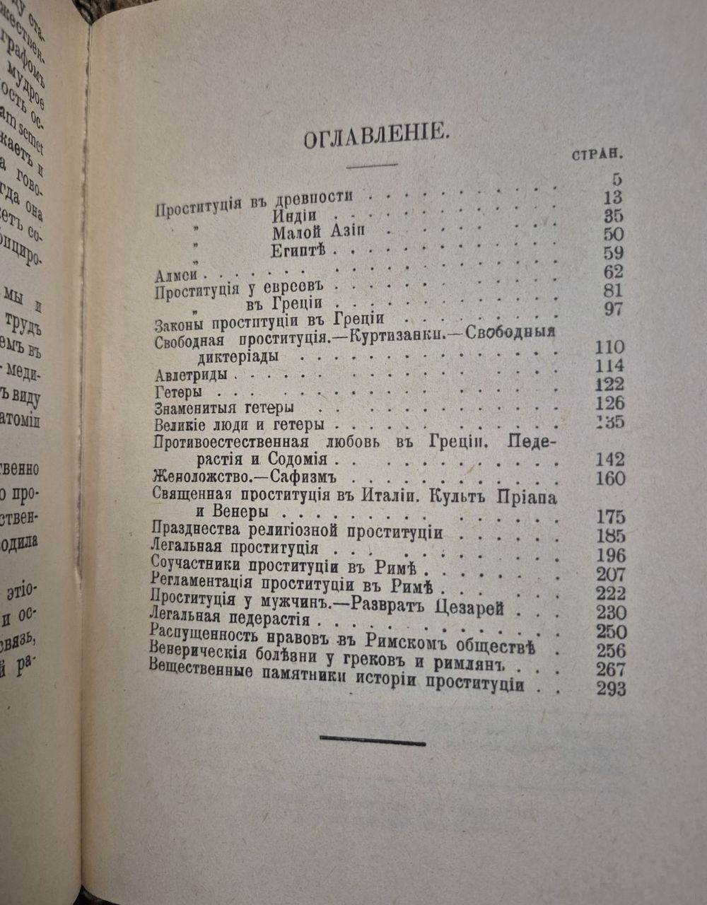 Книга рассказывает о проституции в древности в разных странах мира, а также педерастии и содомии, о празднествах религиозной проституции, о проституции среди мужчин, о венерических болезнях у греков и римлян. Своё повествование автор подтверждает существованием вещественных памятников истории проституции.
