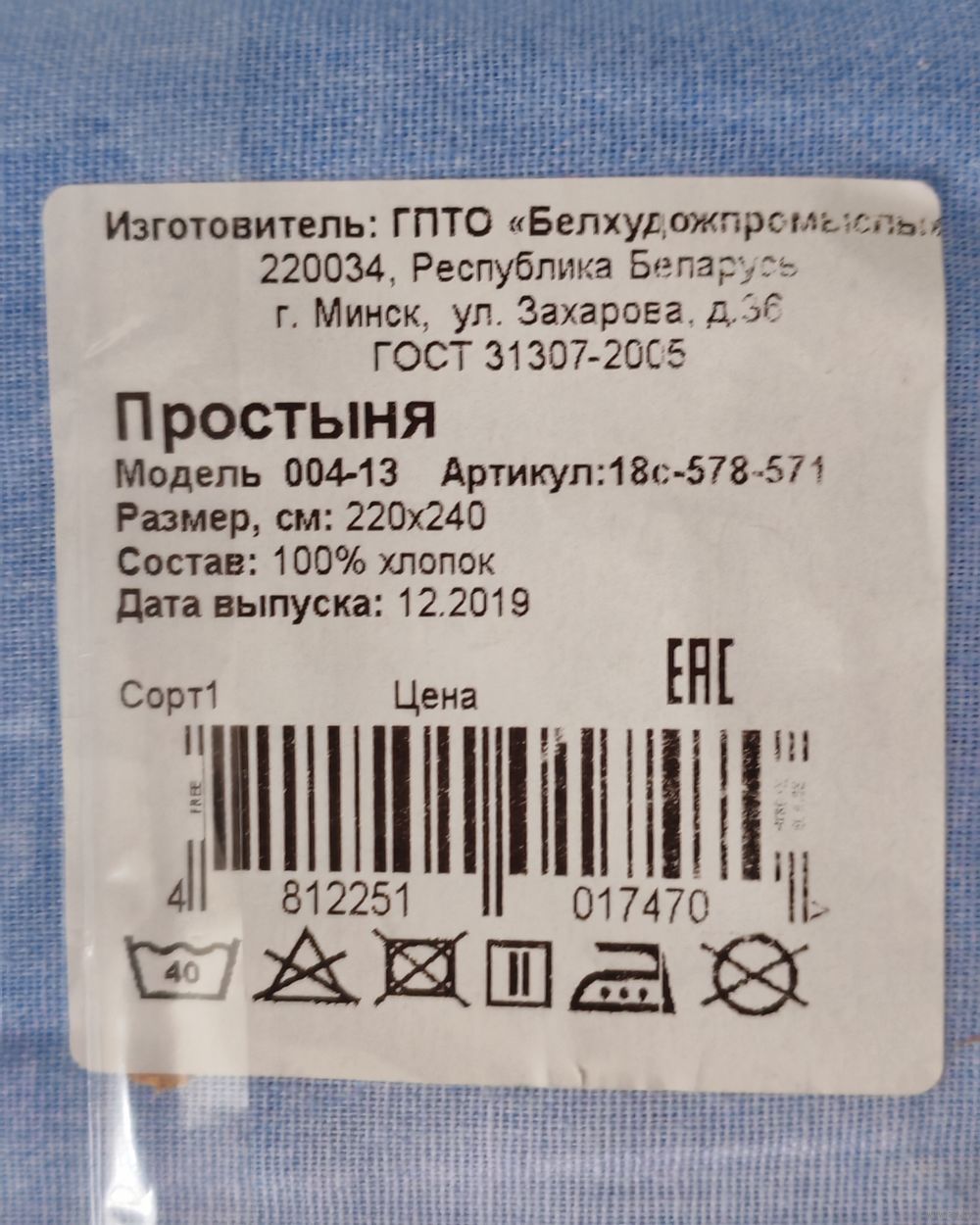 ИЗГОТОВИТЕЛЬ : ГПТО "БЕЛХУДОЖПРОМЫСЛЫ".