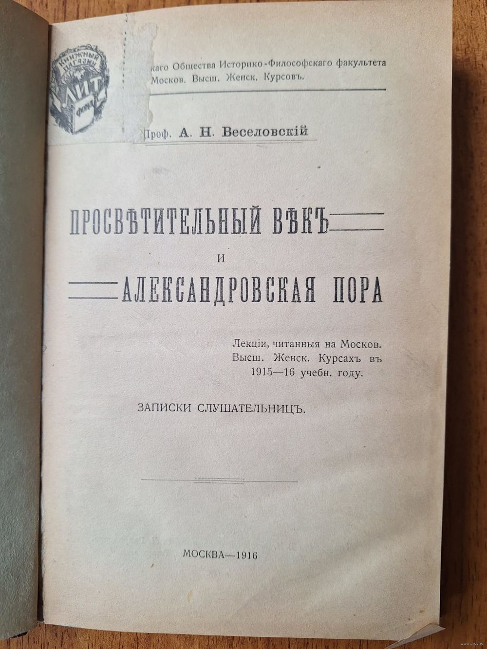 "Просвятительский век и Александровская пора" 1916 г. Москва. 180 стр. Страницы все. Проф. А.Н. Веселовский.