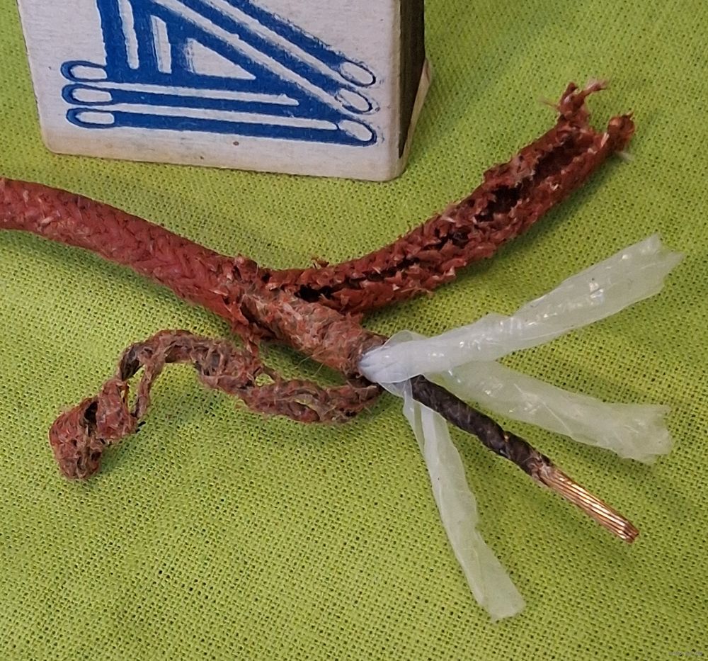 Но последовательность слоев изоляции иная. И в качестве первого слоя применено похоже на стекловолокно с пропиткой. Второй слой из трех фторопластовых лент. Третий из навитых асбестовых (?) нитей. Четвертый из таких же нитей но переплетенных "косичкой".