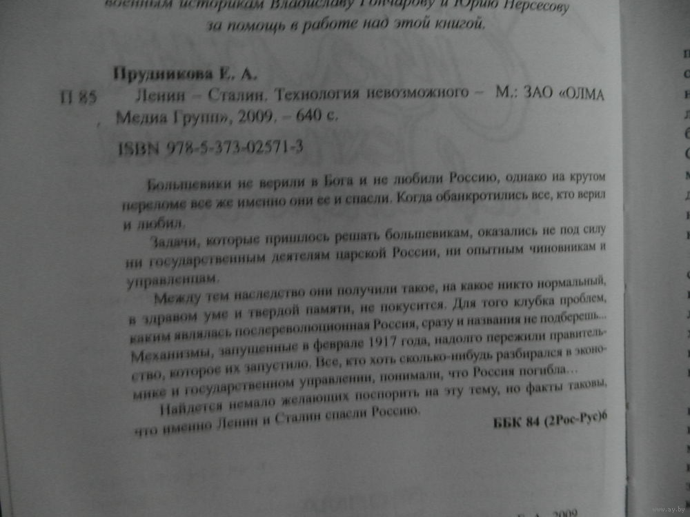 Прудникова Е. А. — российская писательница и журналистка, автор книг на исторические темы, связанные с биографиями И. В. Сталина, Л. П. Берии. С 2007 года является главным редактором газеты «Наша версия на Неве». Оценивая исторические события, автор книги делает акцент на том, что большевики не верили в Бога и не любили Россию, однако на крутом переломе все же именно они ее и спасли. Когда обанкротились все, кто верил и любил. Задачи, которые пришлось решать большевикам, оказались не под силу ни государственным деятелям царской России, ни опытным чиновникам и управленцам. Между тем наследство они получили такое, на какое никто нормальный, в здравом уме и твердой памяти, не покусится. Для того клубка проблем, каким являлась послереволюционная Россия, сразу и названия не подберешь... Механизмы, запущенные в феврале 1917 года, надолго пережили правительство, которое их запустило. Все, кто хоть сколько-нибудь разбирался в экономике и государственном управлении, понимали, что Россия погибла... Найдется немало желающих поспорить на эту тему, но факты таковы, что именно Ленин и Сталин спасли Россию.