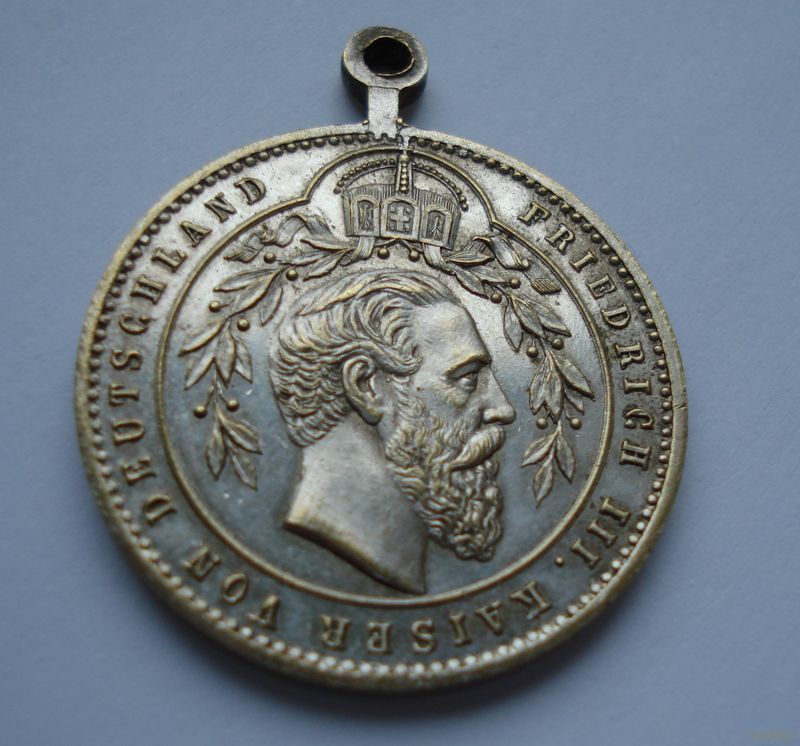 На изображении представлена немецкая памятная медаль 1888 года, посвященная императору Фридриху III. Описание и исторический контекст Медаль была выпущена в так называемый «Год трёх императоров» (1888), когда в Германии сменилось три правителя. Фридрих III правил всего 99 дней и скончался от рака горла в июне того же года.