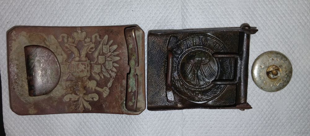 Пряжки Российская императорская армия.Сотояние хорошее. Пряжка немецкой армии без свастики. Возможно 1930-х годов. Материал корпуса латунь. С утратами как есть. Пуговица ВМФ Германии 1940 год. Без торга. Почта наложенным платежом за счёт покупателя. Всё только одним лотом
