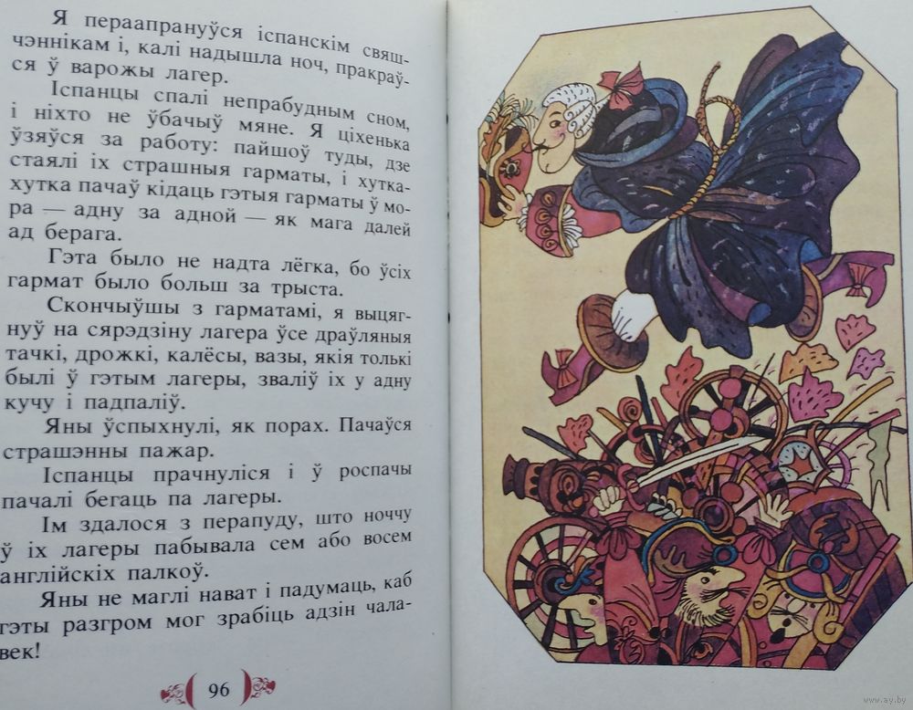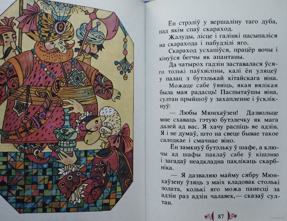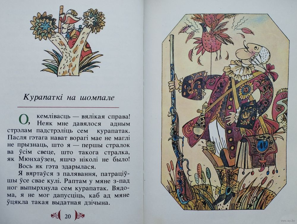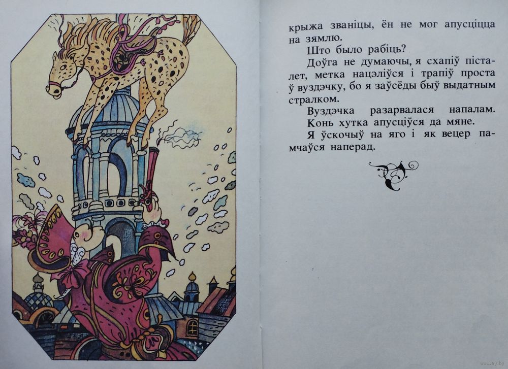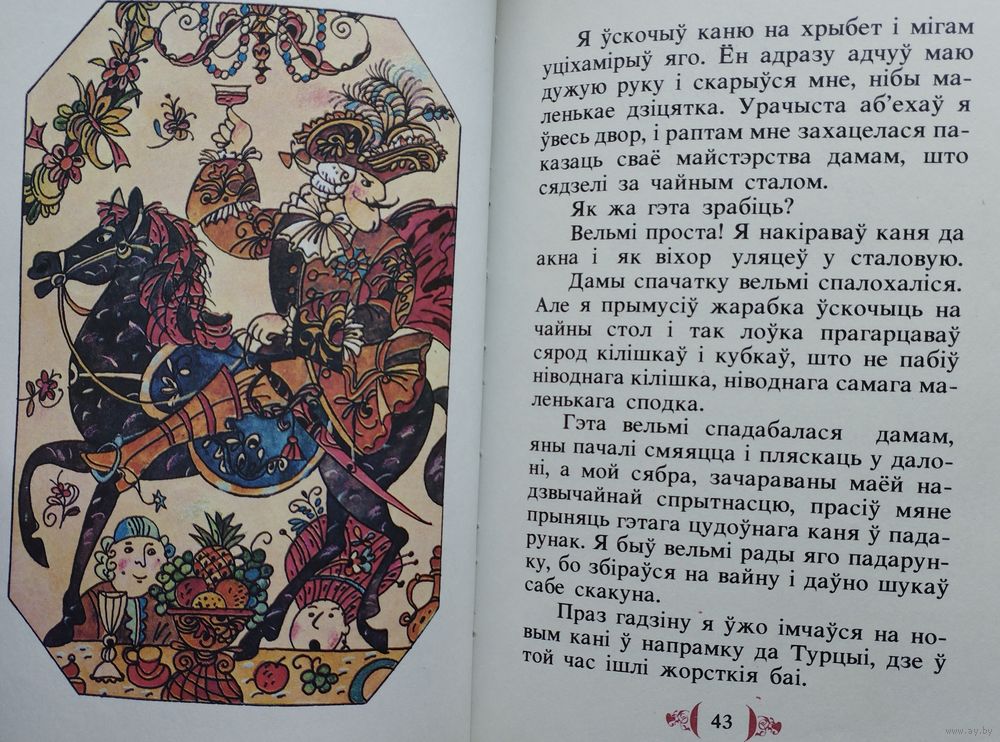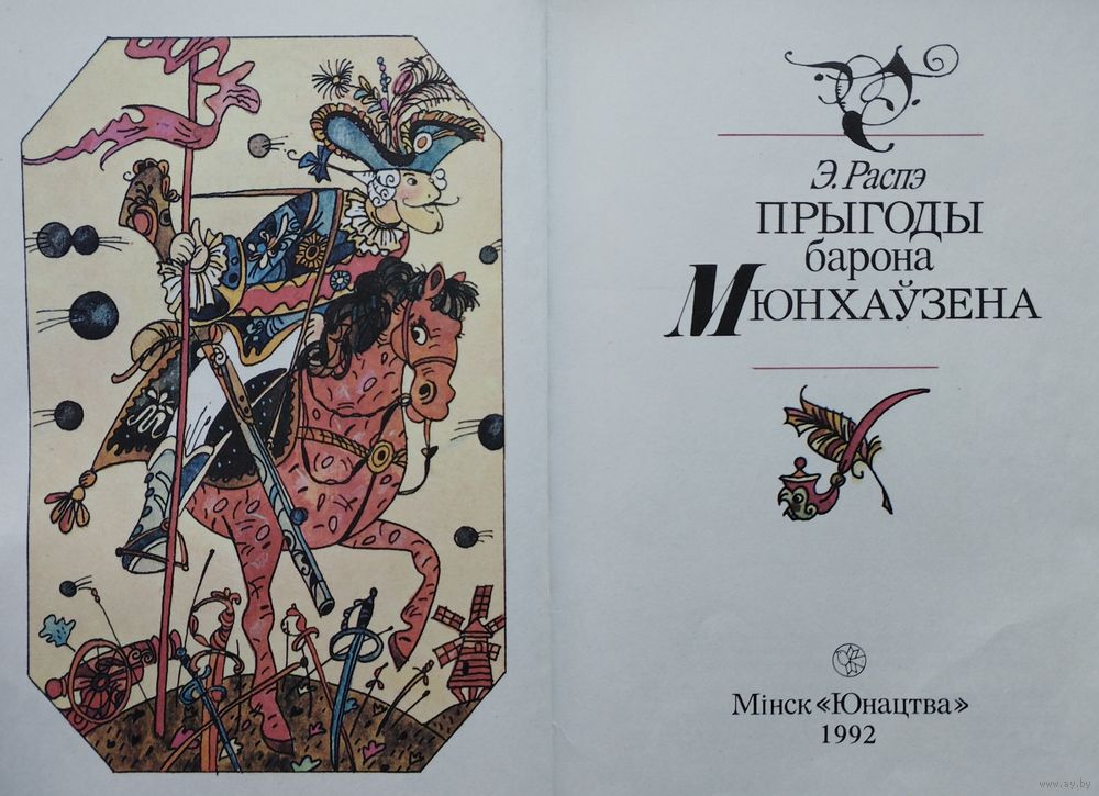 Вялікі фармат. Наклад 6000 ас. 128 стар. мастак М. Казлоў. У кнізе чытача чакае сустрэча з вядомым фантазёрам і прыдумшчыкам баронам Мюнхаўзенам. Ён будзе лятаць на гарматным ядры, скакаць на палавіне каня, падарожнічаць на Месяц – усіх прыгод не пералічыш! У выдатным перакладзе на беларускую мову Віталя Вольскага твор уваходзіць у вучэбную праграму па беларускай літаратуры