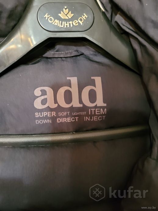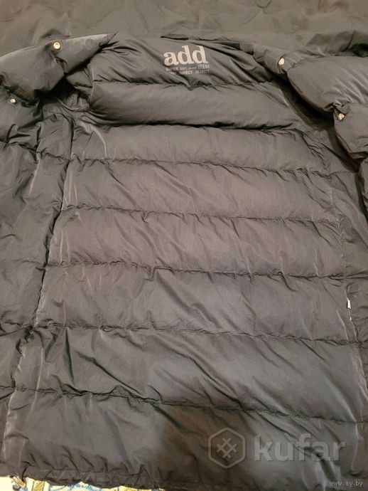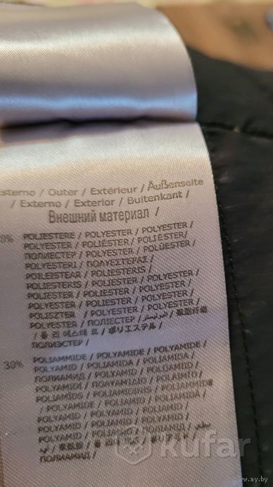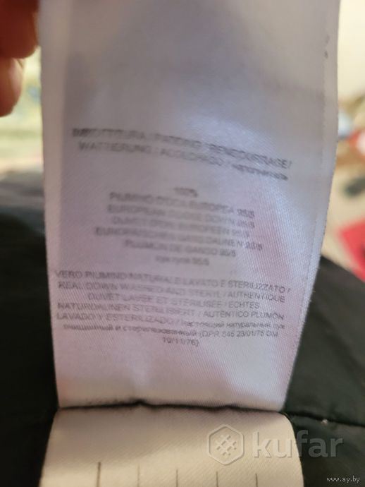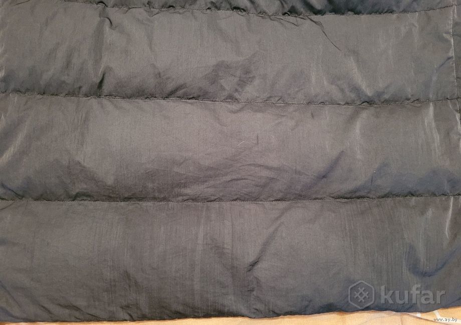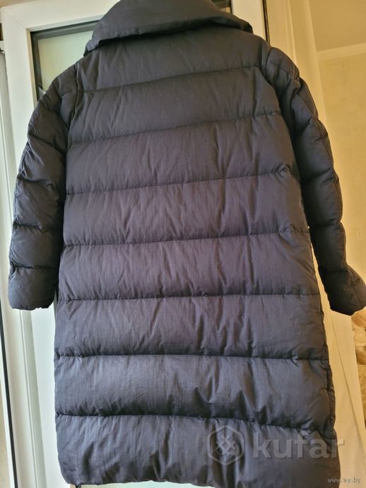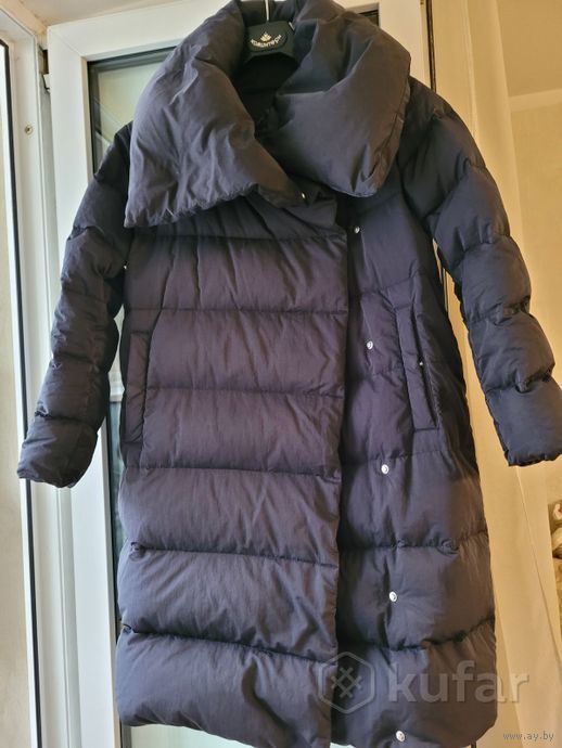 Размер 42. Цвет- темно- синий. Утеплитель- пух 100% . Есть нюанс-пятна в виде полосок на спинке внизу, при носке не очень видно.