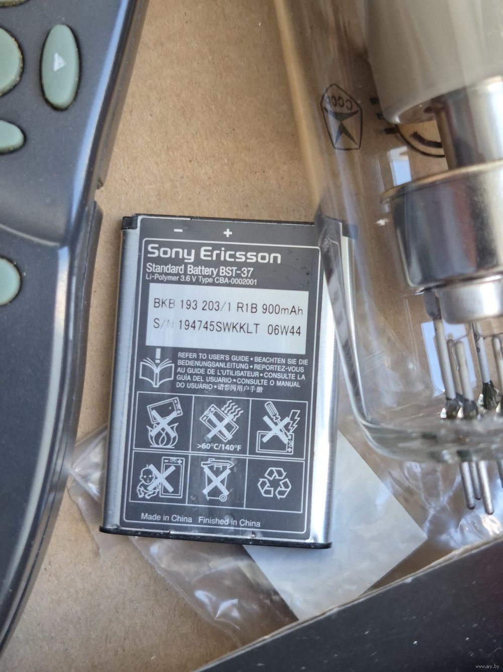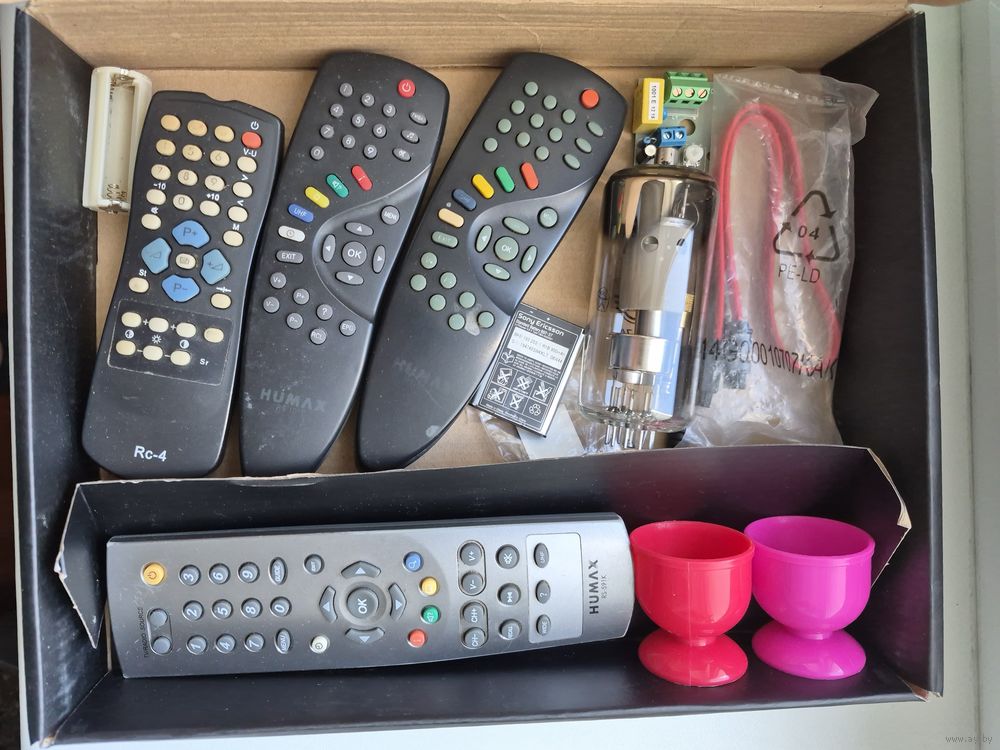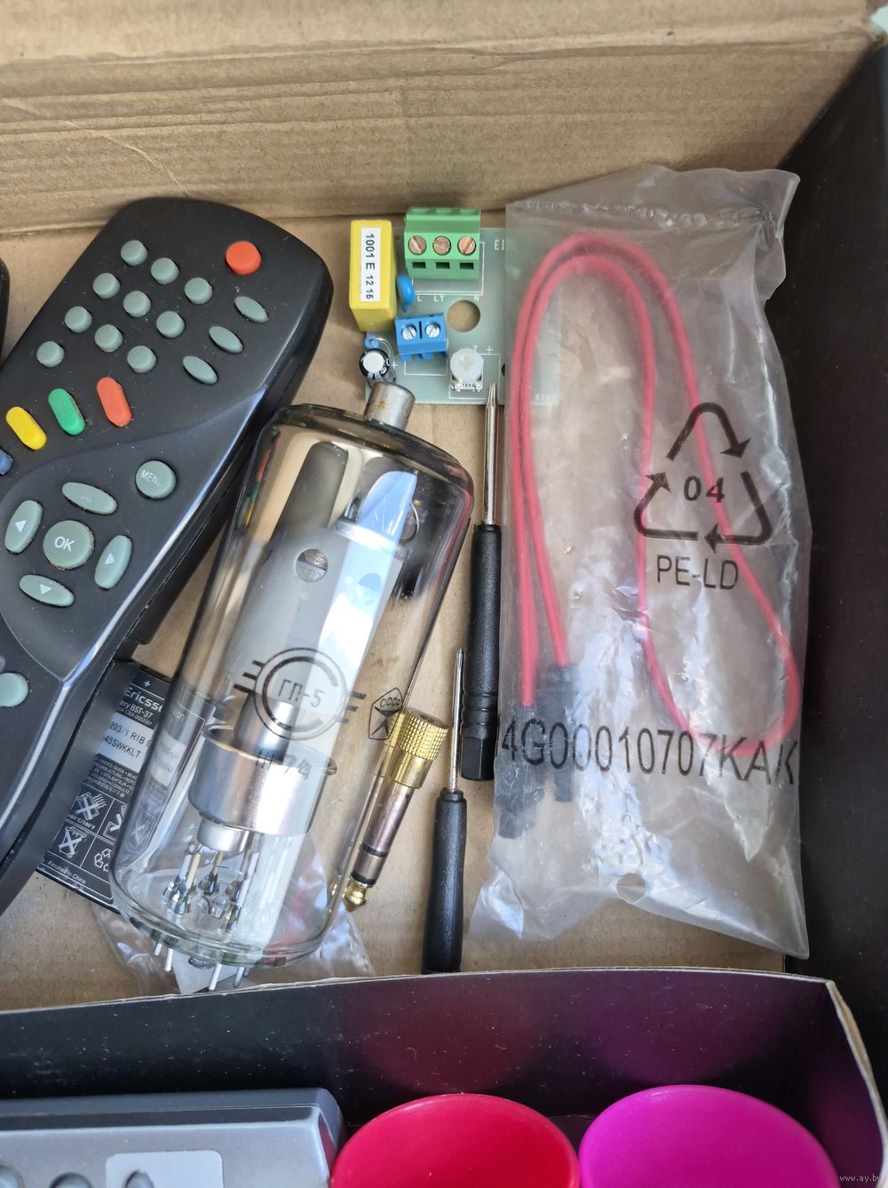 Коробка с разными вещами: пульты ДУ, АКБ, лампа электронная, кабель SATA, отвертки, штекер аудио. Все б/у.