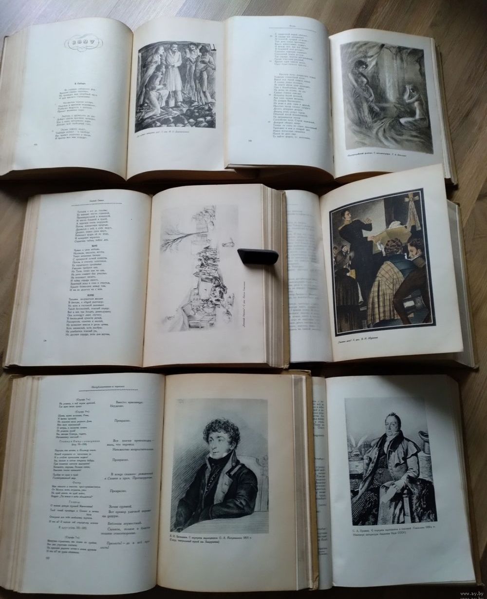 Содержание: Том 1-й: «Стихотворения 1813-1830» (1936 г. 822 с., 18 л. илл., портрет., факсимиле). Том 2-й: «Стихотворения 1831-1836. Сказки. Поэмы. Записи сказок и поэм» (1936 г. 617 с., 20 л. илл., портрет., факсимиле). Том 3-й: «Евгений Онегин. Драматические произведения» (1936 г. 481 с., 19 л. илл., портрет., факсимиле). Том 4-й: «Повести. Путешествие в Арзрум. История Пугачева. Матриалы к Истории Пугачева» (1936 г. 805 с., 28 л. илл., портрет., факсимиле). Том 5-й: «Критика. История. Публицистика. Дневники и материалы записных книжек» (1936 г. 733 с., 18 л. илл., портрет., факсимиле). Том 6-й: «Письма 1815-1837» (1938 г. 651 с., 27 л. илл., портрет., факсимиле).