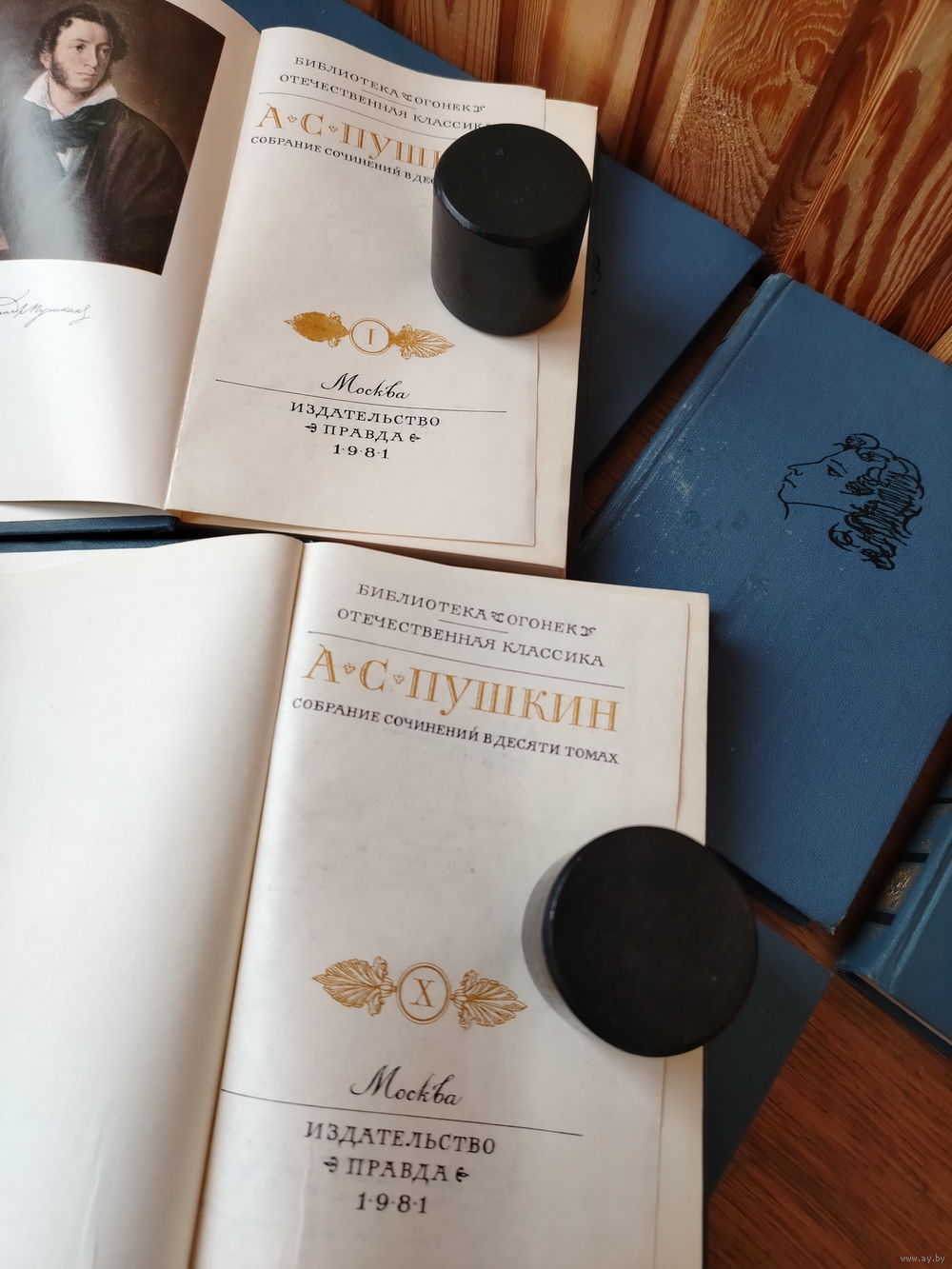 | Есть небольшие пятна-следы на одном томе, см. фото. | |
