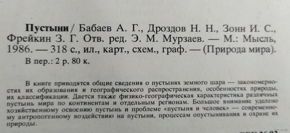 Бабаев А.Г., Зонн И.С., Дроздов Н.Н., Фрейкин З.Г. Пустыни. Ответственный редактор докт. геогр. наук Э.М.Мурзаев. Серия: Природа мира. М.: Мысль, 1986г., 320 с. Твёрдый переплёт, энциклопедический формат.