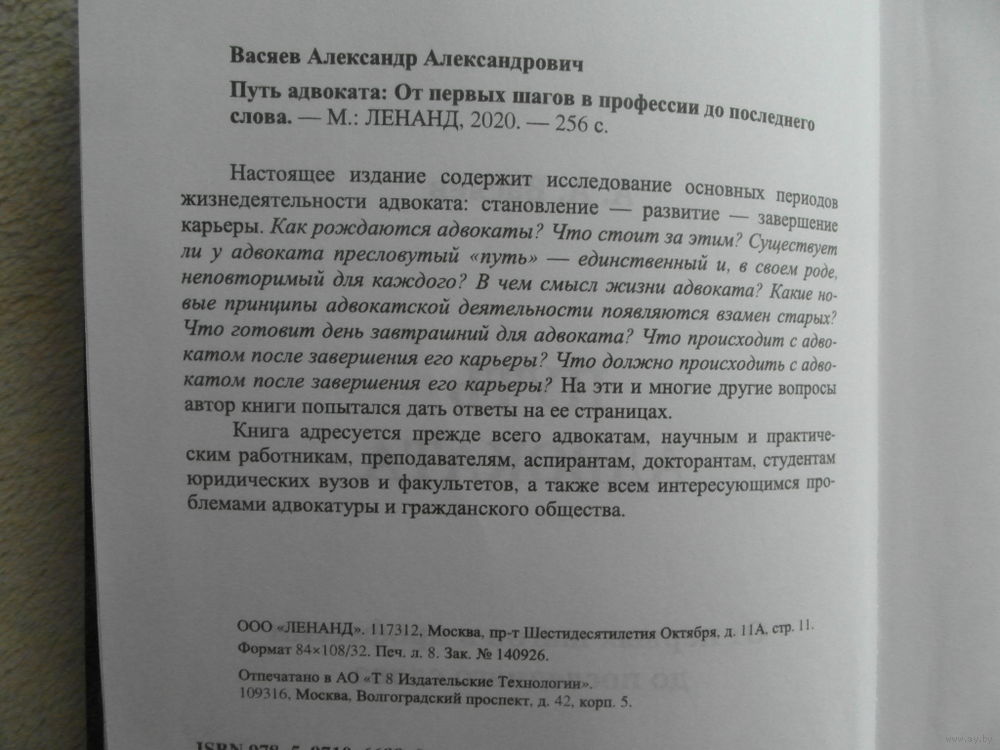 Настоящее издание содержит исследование основных периодов жизнедеятельности адвоката: становление — развитие — завершение карьеры. Как рождаются адвокаты? Что стоит за этим? Существует ли у адвоката пресловутый «путь» — единственный и, в своем роде, неповторимый для каждого? В чем смысл жизни адвоката? Какие новые принципы адвокатской деятельности появляются взамен старых? Что готовит день завтрашний для адвоката? Что происходит с адвокатом после завершения его карьеры? Что должно происходить с адвокатом после завершения его карьеры? На эти и многие другие вопросы автор книги попытался дать ответы на ее страницах.