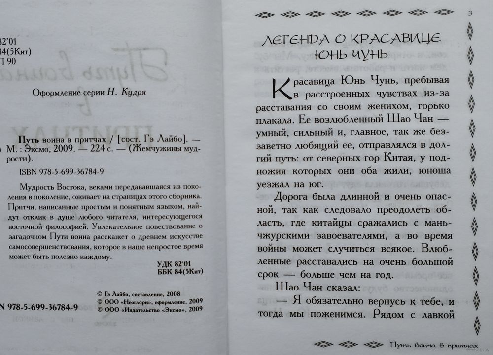 Тираж 3000 экз. 226 стр. Тиснение золотом, частичная лакировка. Мудрость Востока, веками передававшаяся из поколения в поколение, оживает на страницах этого сборника. Притчи, написанные простым и понятным языком, найдут отклик в душе любого читателя, интересующегося восточной философией. Увлекательное повествование о загадочном Пути воина расскажет о древнем искусстве самосовершенствования, которое в наше непростое время может быть полезно каждому. Составитель: Гэ Лайбо.