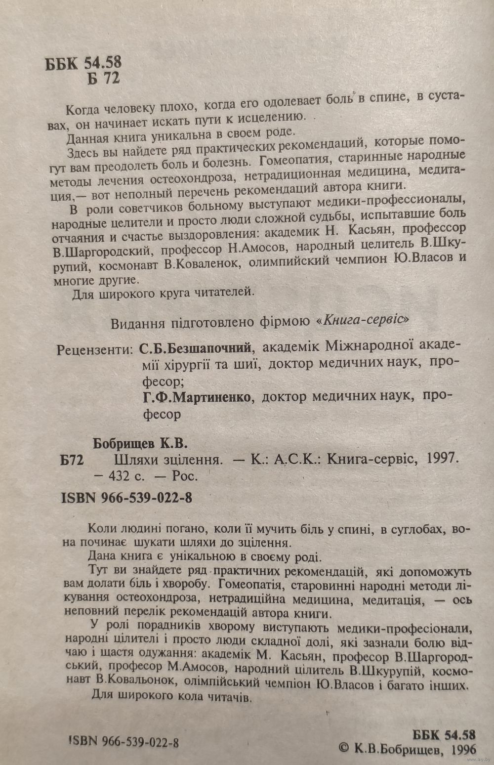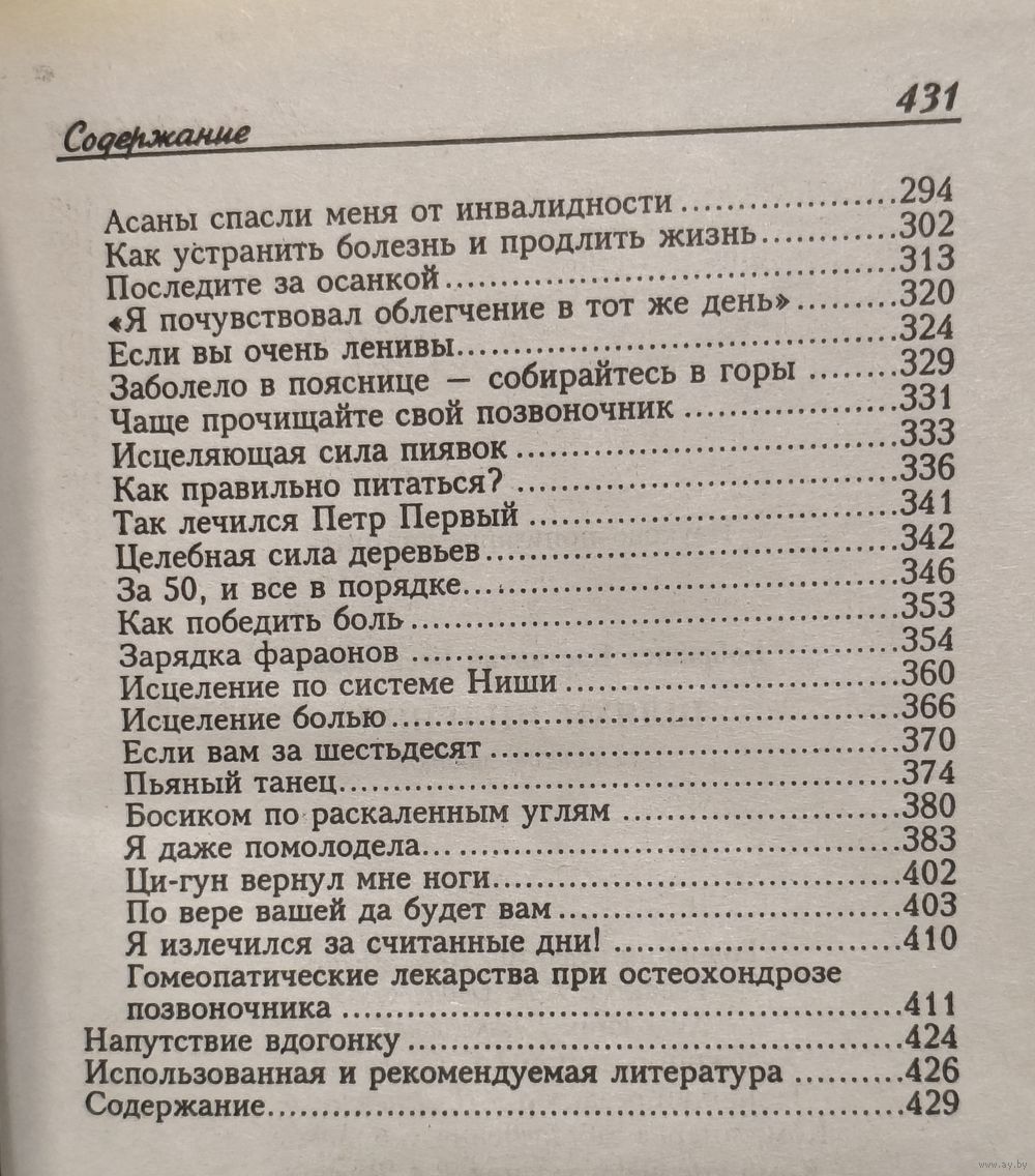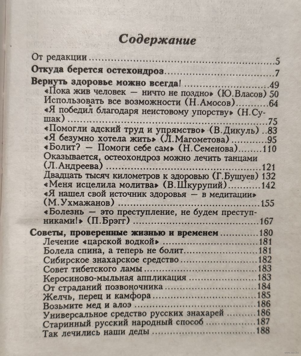 Когда человеку плохо, когда его одолевает боль в спине, в суставах, он начинает искать пути к исцелению. Данная книга уникальна в своем роде. Здесь вы найдете ряд практических рекомендаций, которые помогут вам преодолеть боль и болезнь. Гомеопатия, старинные народные методы лечения остеохондроза, нетрадиционная медицина, медитация, — вот неполный перечень рекомендаций автора книги. В роли советчиков больному выступают медики-профессионалы, народные целители и просто люди сложной судьбы, испытавшие боль отчаяния и счастье выздоровления: академик Н.Касьян, профессор В.Шаргородский, профессор Н.Амосов, народный целитель В.Шкурупий, космонавт В.Коваленок, олимпийский чемпион Ю.Власов и многие другие.