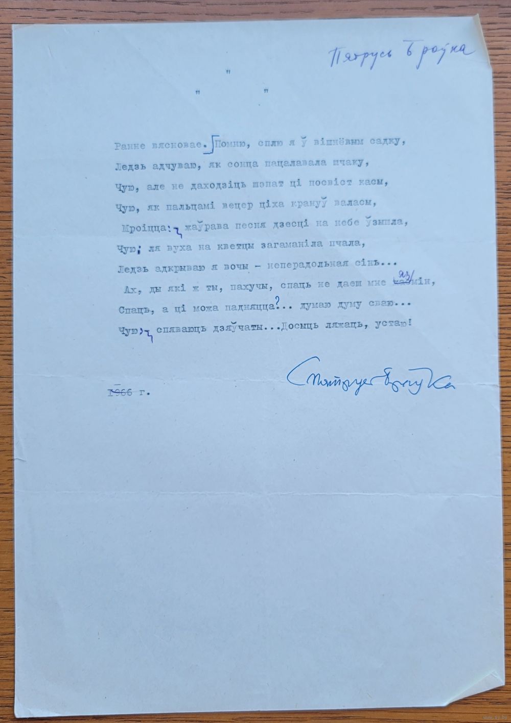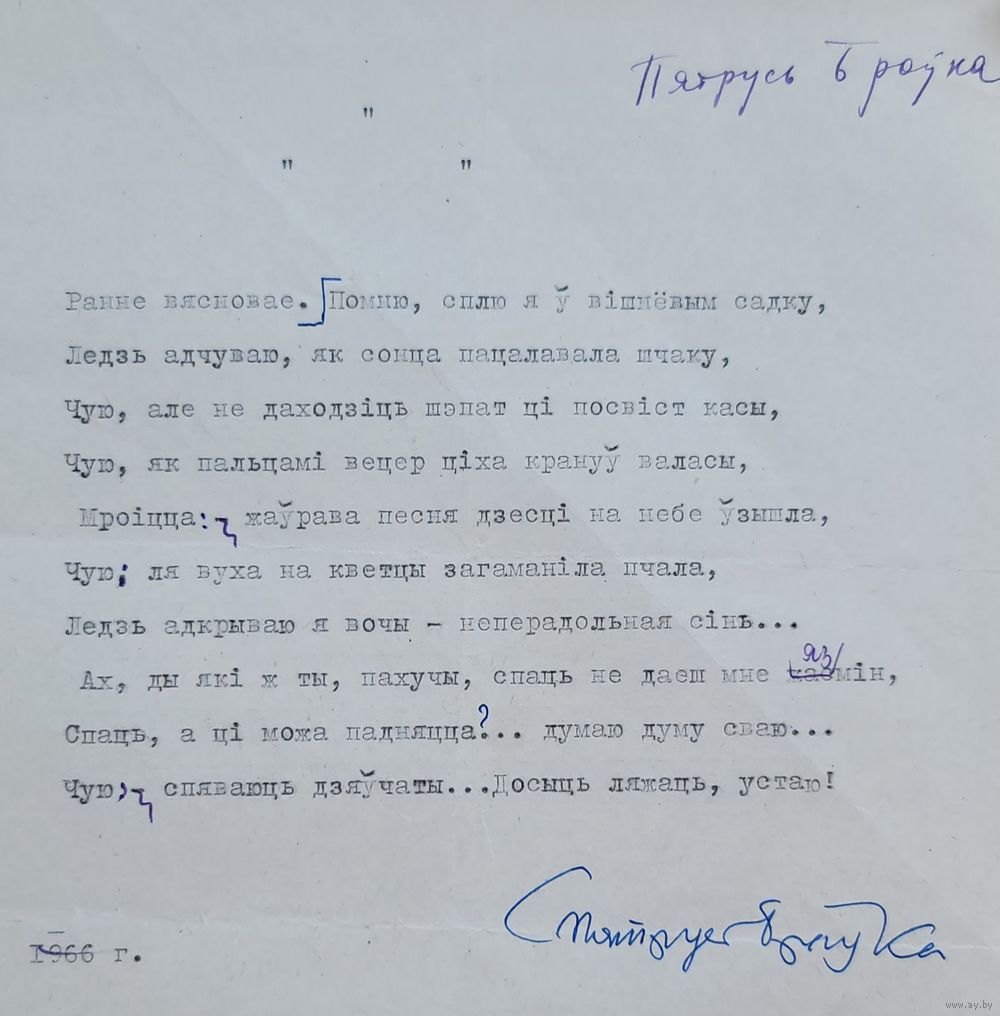 Пятрусь Броўка рукапіс верша у зборнік Дзень паэзіі 1966