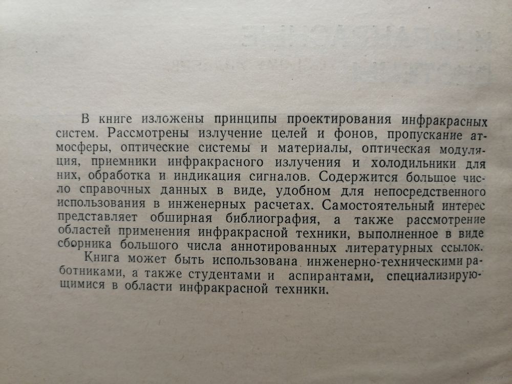 В книге изложены принципы проектирования инфракрасных систем. Рассмотрены излучение целей и фонов, пропускание атмосферы, оптические системы и материалы, оптическая модуляция, приемники инфракрасного излучения и холодильники для них, обработка и индикация сигналов. Содержится большое число справочных данных в виде, удобном для непосредственного использования в инженерных расчетах. Самостоятельный интерес представляет обширная библиография, а также рассмотрение областей применения инфракрасной техники, выполненное в виде сборника большого числа аннотированных литературных ссылок.