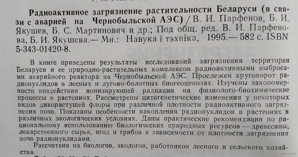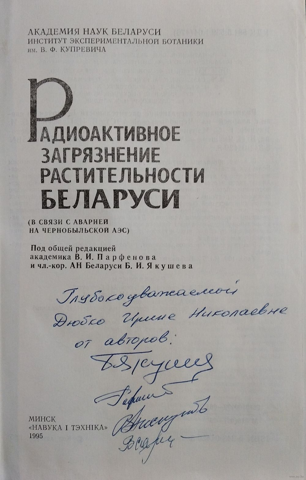 Радиоактивное загрязнение растительности Беларуси: (в связи с аварией на Чернобыльской АЭС) . Академия наук Беларуси, Институт экспериментальной ботаники им. В. Ф. Купревича. - Минск : Навука і тэхніка, 1995. - 582 с. Твердая обложка.