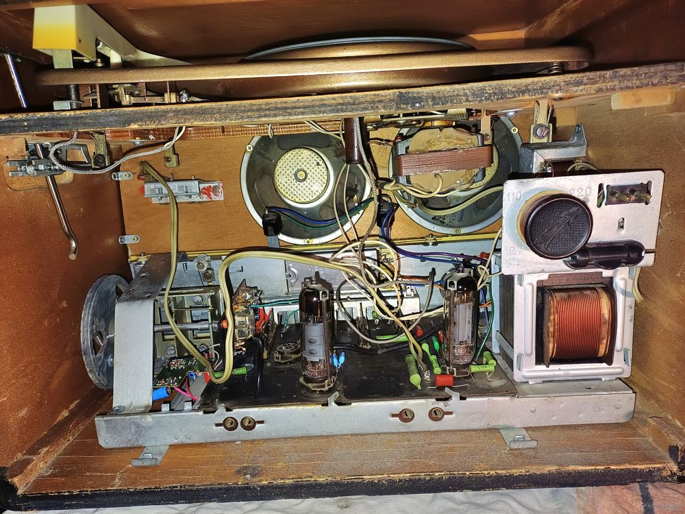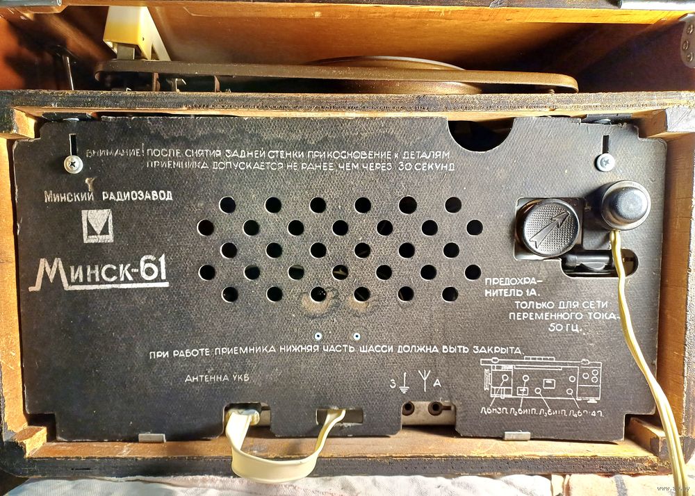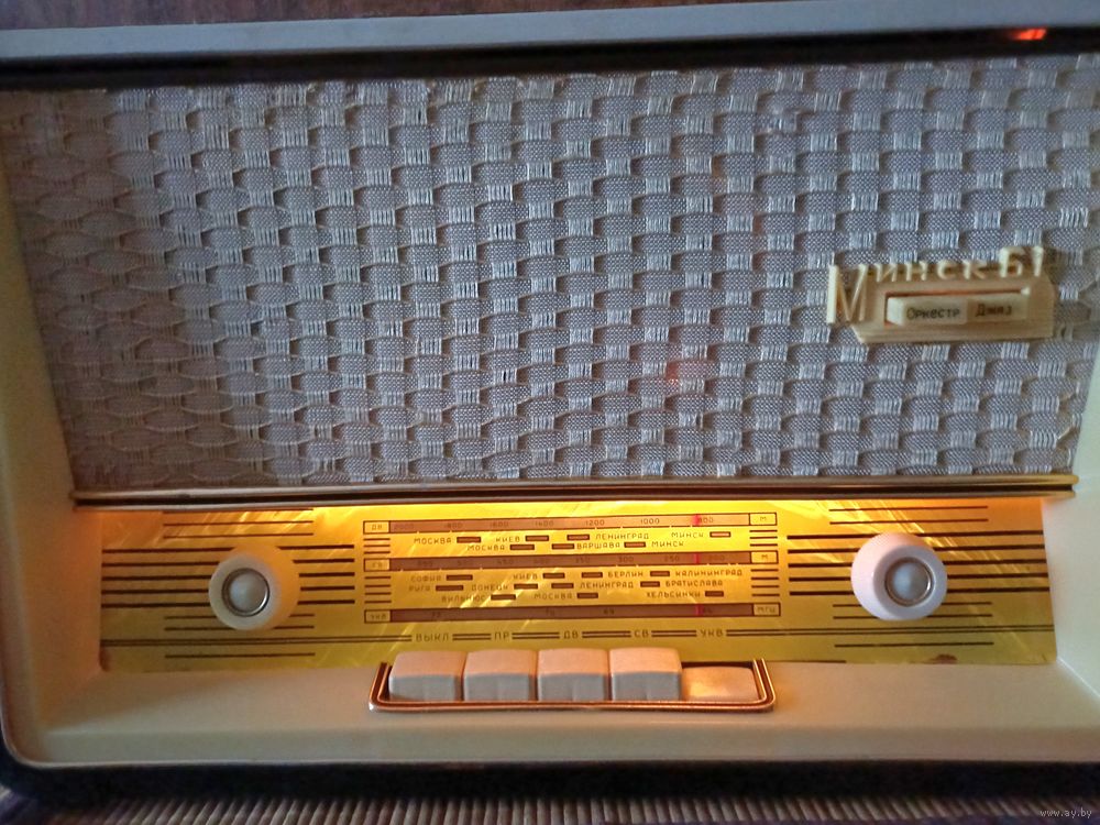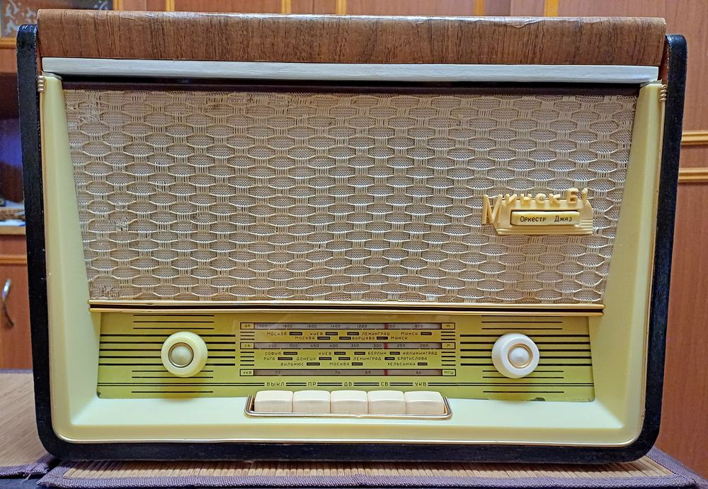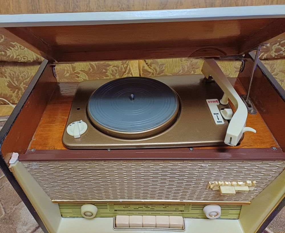 После реставрации. Работают и радио, и проигрыватель. Произведена фанеровка корпуса. Радиоткань оригинальная. Проигрыватель отремонтирован, отрегулирован. Установлена современная головка звукоснимателя, игла приобретается на Алиэкспресс за копейки. Радио принимает станции диапазона ФМ 88 - 108 МГц, а также "советского" - 65 - 74 МГц. Никаких блютусов - установлена радиоплата, настройка ручкой, как в оригинале. Тон-регистр работает. Принимает на простую проволочную антенну. Усилитель штатный, ламповый. Очень компактная - размеры 42х31х26 см. Вышлю любой почтой.