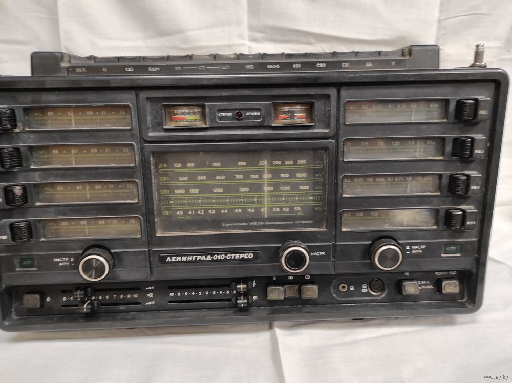 Стереофонический радиоприёмник "Ленинград-010-стерео" с 1979 года выпускал Ленинградский завод "Радиоприбор". Радиоприёмник ''Ленинград-010-стерео'' предназначен для приёма радиовещательных станций в диапазонах ДВ, CB-I, CB-II, пяти коротковолновых и УКВ-ЧМ. По параметрам приёмник соответствует требованиям ГОСТ 5651-76 на модели высшего класса, а по некоторым из них имеет и значительный запас. Высокая чувствительность достигнута в диапазонах ДВ и СВ применением 2-х отдельных магнитных антенн, в диапазоне УКВ симметричного вибратора из двух телескопических антенн, в диапазонах KB они включаются параллельно с использованием балансных смесителей каскадов. Высокая селективность обеспечивается многоконтурным ФСС и двумя пьезокерамическими фильтрами. Приёмник имеет три раздельные группы шкал с отдельными ручками для настройки. Предусмотрена и возможность фиксированной настройки на 4 заранее выбранные станции в диапазоне УКВ и такое же число станций в поддиапазонах КВ. Во всех диапазонах возможна бесшумная настройка. Автоматическая подстройка частоты (КВ, УКВ) включается нажатием на соответствующую ручку настройки, причём после этого настройка этой ручкой становится невозможной. В приёмнике имеются световые индикаторы приёма стереофонических передач и многолучевого приёма в диапазоне УКВ, стрелочные индикаторы точной настройки, напряженности поля и напряжения источника питания. Для улучшения звука моно-программ предусмотрен перевод усилителя приёмника в режим псевдостерео. К приёмнику можно подключить внешние антенны, магнитофон, проигрыватель, стереотелефоны. В АС применены широкополосные громкоговорители ЗГД-32. АС крепятся к корпусу и могут разнесены для улучшения стереоэффекта. Питание от 6 элементов А-373 и через встроенный БП от электрической сети. Чувствительность со входов внешних антенн, мкВ (с встроенными антеннами, мкВ/м), в диапазонах; ДВ - 50/800. СВ - 50/500. KB - 30/50. УКВ - 2,5/5. Селективность приёмника; дБ, по каналам: соседнему 70, зеркальному и другим побочным 50...100. Диапазон воспроизводимых частот, Гц, в диапазонах АМ при полосе пропускания: узкая 80...2400, средняя 80...4000, широкая 80...6300, ЧМ - 80...12500. Максимальная выходная мощность, Вт при питании от батарей 2х1,5, от сети 2х4. Потребляемая от сети мощность Вт, 25. Габариты приёмника с прикрепленными АС - 430х388х150 мм. Общая масса 9,5 кг. Розничная цена 375 рублей.