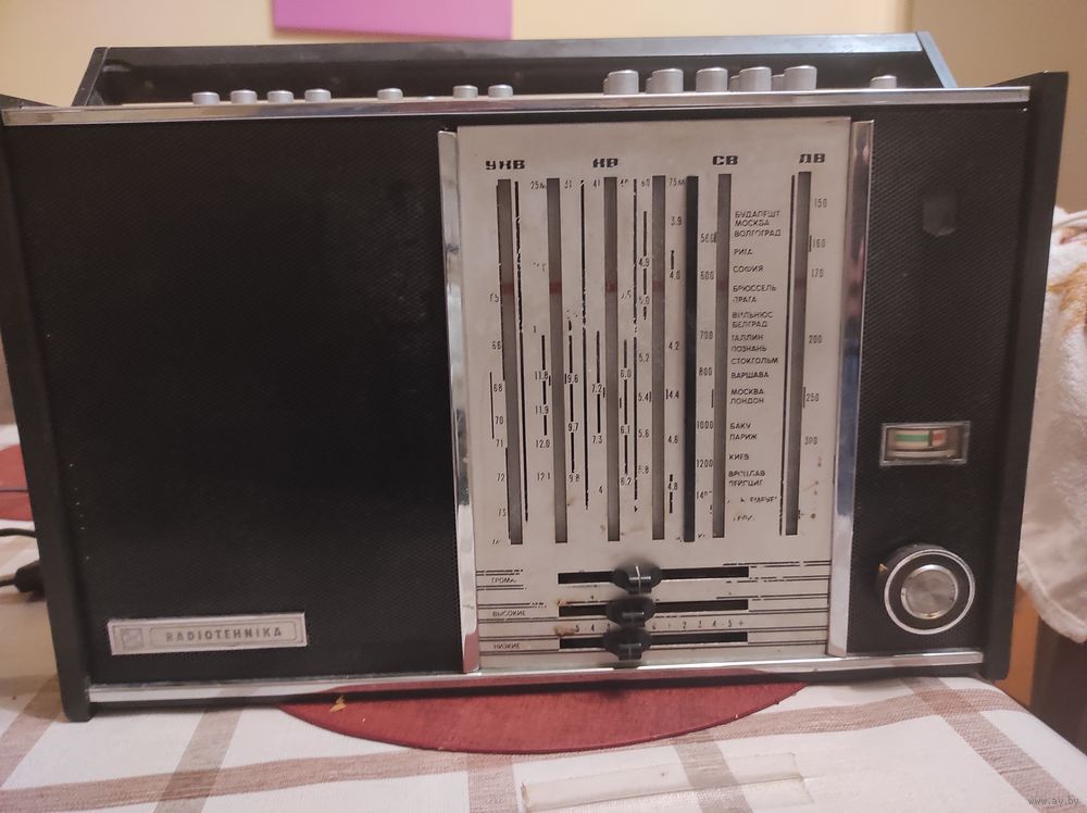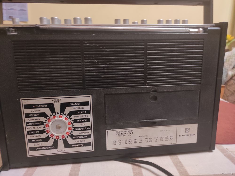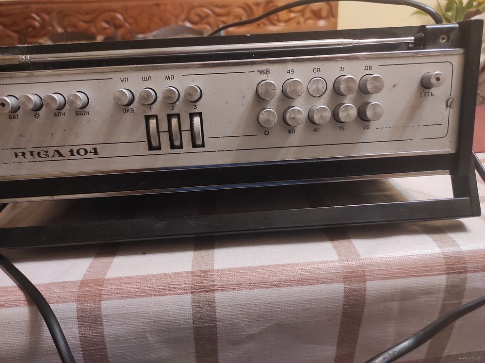 Переносной радиоприёмник "Рига-104" с 1973 года выпускал Рижский радиозавод имени А.С.Попова. Приёмник работает в диапазонах ДВ, СВ, КВ и УКВ. имеет возможность настройки на одну из трёх фиксированных станций в УКВ диапазоне. Номинальная выходная мощность усилителя 0,8 Вт, максимальная 2,5 Вт. Приёмник имеет плавную регулировку громкости и тембров и работает на громкоговоритель 3ГД-32. Имеются гнёзда внешней антенны, УКВ диполя, ЭПУ, магнитофона, внешнего громкоговорителя и головных телефонов. Питание от 6 элементов 373 или от сети через встроенный выпрямитель. Размеры приёмника 389х240х135 мм, вес с батареями 6,3 кг. Приёмники выпускали в различном оформлении, с угловыми и ползунковыми регуляторами.