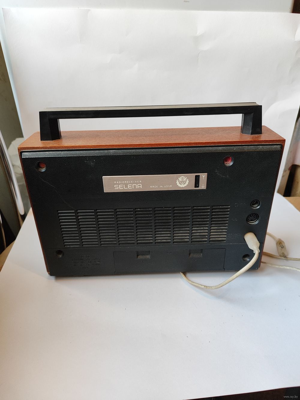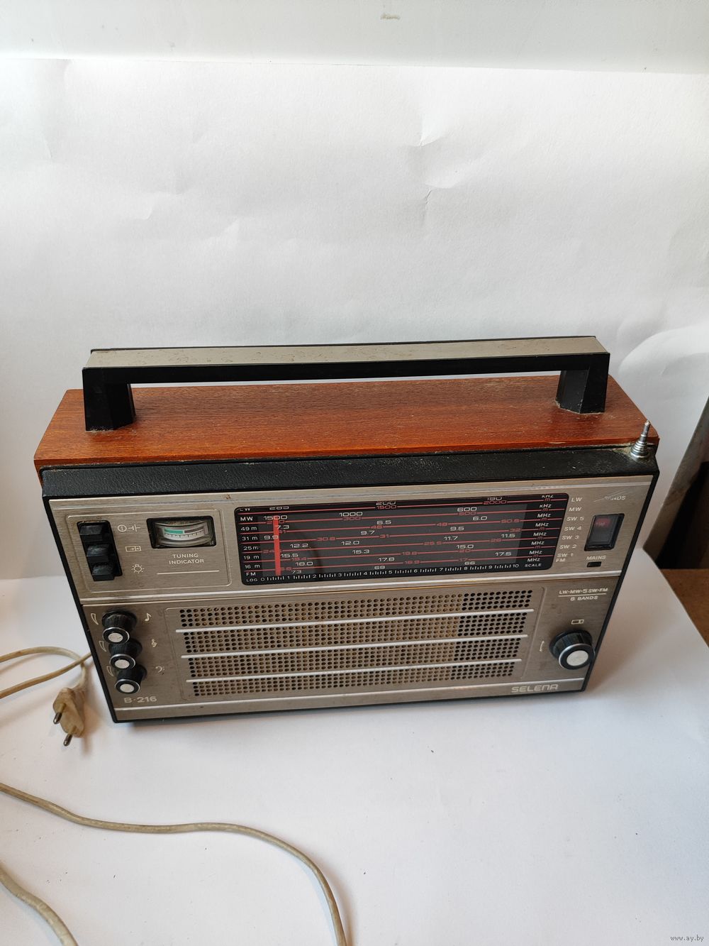 Хорошо работает на УКВ диапазоне(другие диапазоны включаются плохо-надо долго щёлкать переключателем).Внешнее состояние на фото (нет навершия и не вынимается последнее звено антенны). Со шнуром питания. Заводские пломбы.