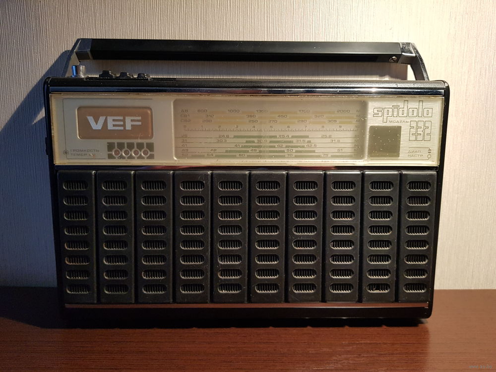 Портативный радиоприёмник "Спидола-232" с 1979 года выпускал Рижский Государственный электротехнический завод "ВЭФ". Переносный транзисторный приёмник 2-го класса ''Вэф-Спидола-232'' рассчитан на приём радиостанций в диапазонах ДВ, СВ и КВ1...KB4. Приём ведется на внутренние магнитную и телескопическую антенны. В приёмнике имеются светодиодный индикатор настройки служащий и для контроля степени разряда батарей, подсветка шкалы, гнёзда головных телефонов, внешней антенны, магнитофона для записи и внешнего питания. В рабочем состоянии. Хороший внешний вид (видно на фото).