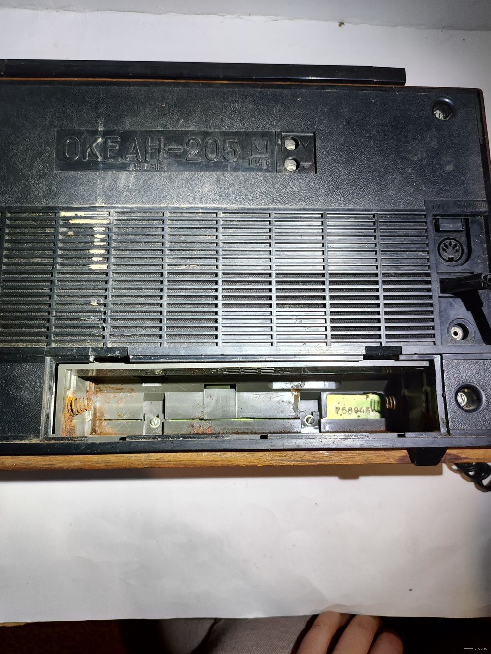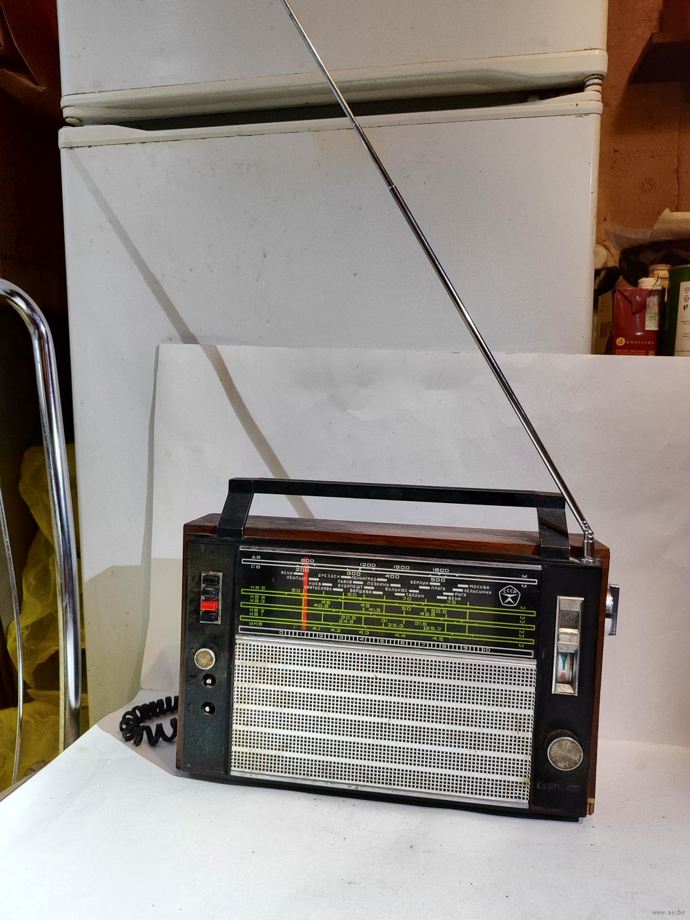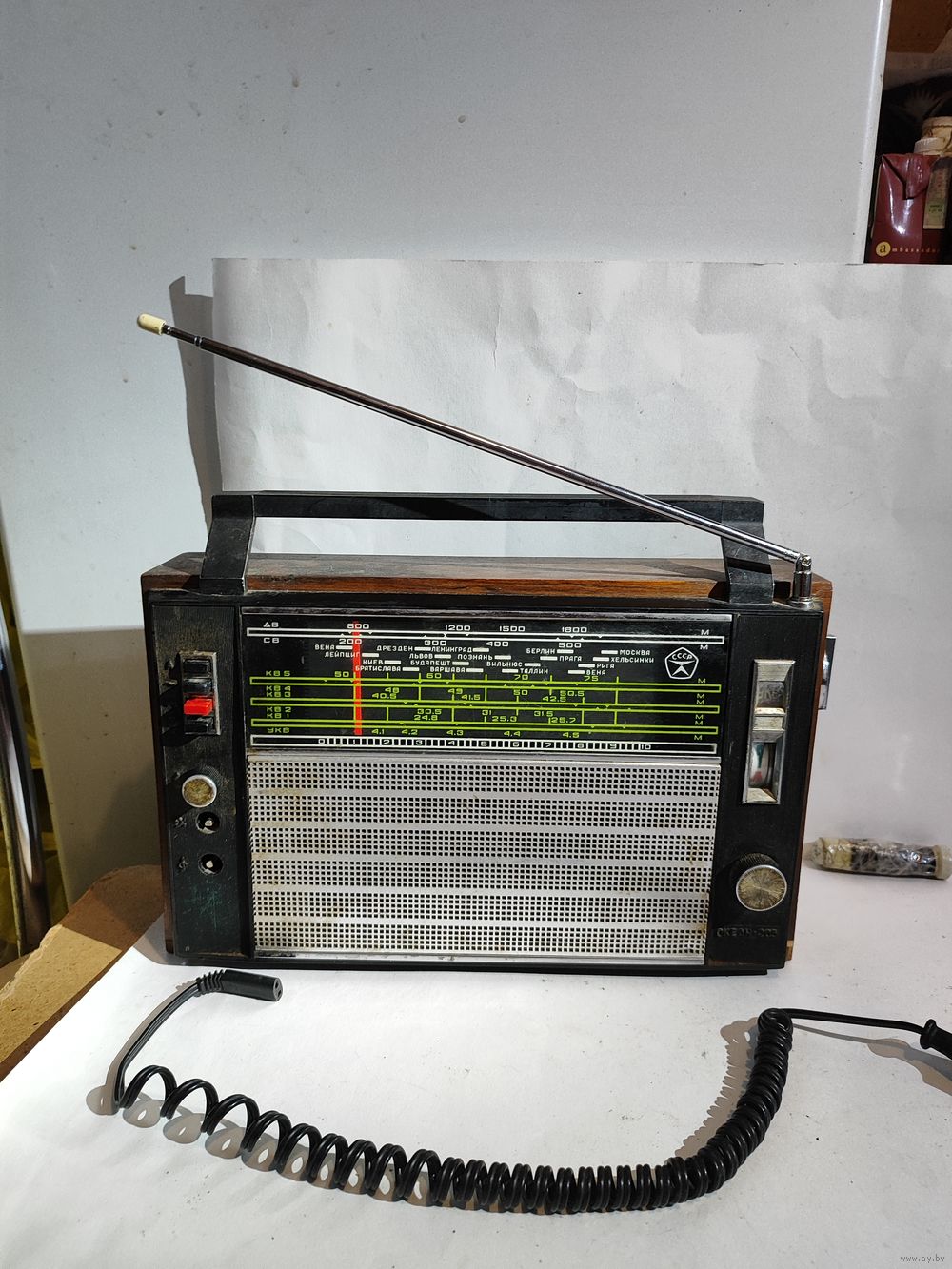 Рабочий, кроме СВ ( св- диапазон, работает не стабильно, иногда может исчезать,иногда может и не включатся). Антенна не родная самодельная -вынимается . Сетевой шнур. Состояние на фото(следы бытования ,нет 2-х ручек,нижний резистор плохо закреплён из за этого "барахлит.").