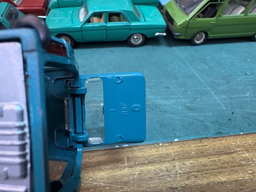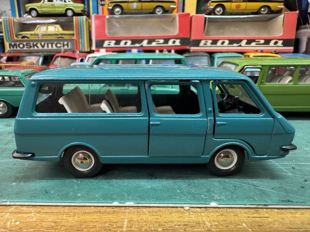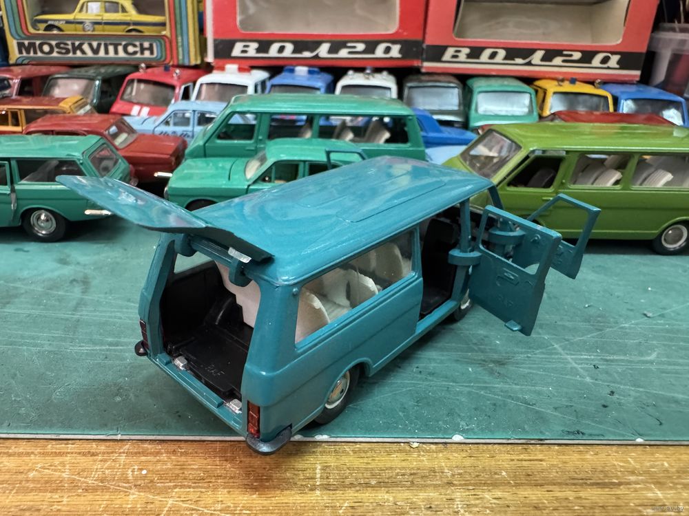 РАФ 2203 постномер, но дно еще металл, цвет бирюза, на дверях "1". На последнем фото он справа. Вечер четверга в зеленых, и не только, тонах