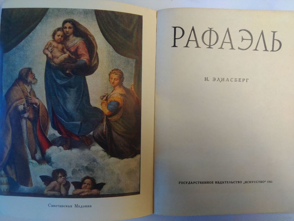11. Н.Е. Элиасберг. Рафаэль (1483-1520). Альбом. Москва, Государственное издательство «Искусство», 1961 г. – 96 стр., 3 цветных и 37 черно-белых иллюстраций. Тираж 20.000 экз. На обложке фрагмент картины Рафаэля «Сикстинская мадонна». 1513-1514 гг. Дрезденская картинная галерея.
