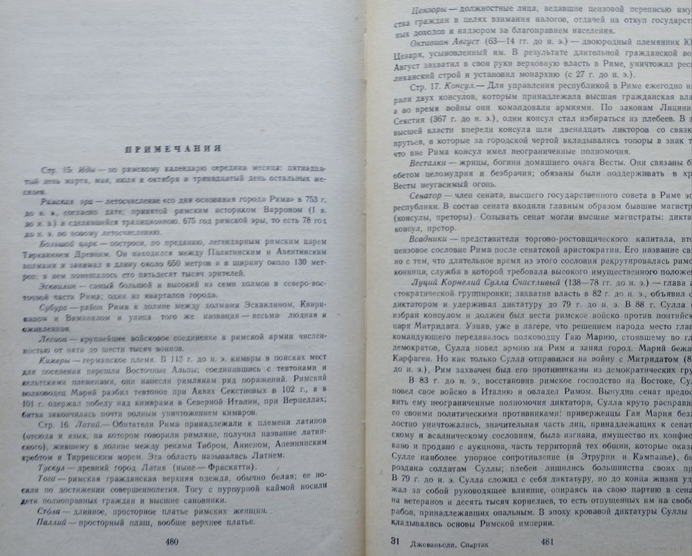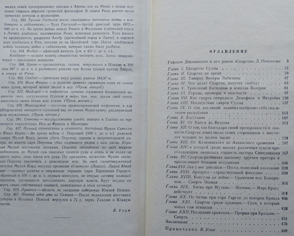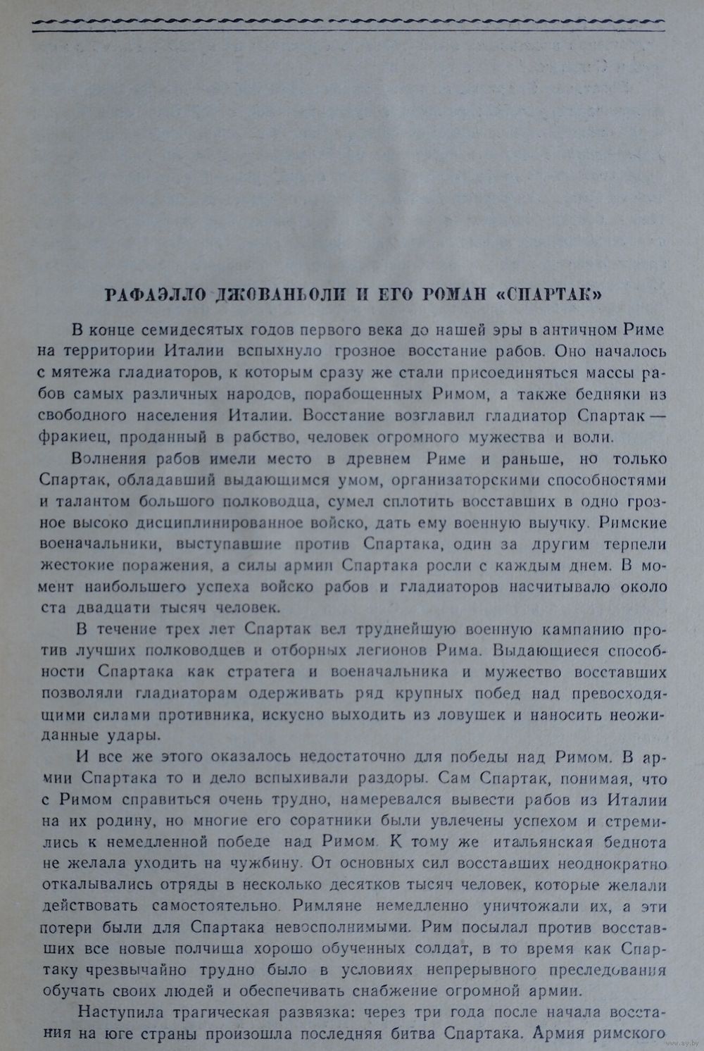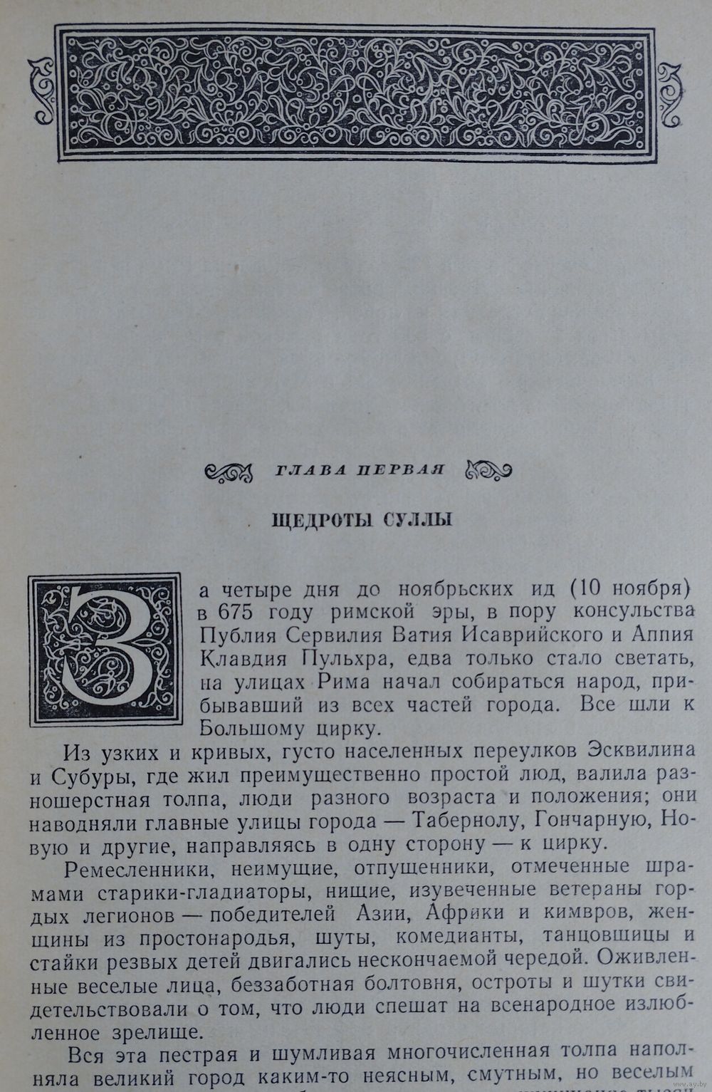 Большой формат. 498 стр. Древний Рим первого века до нашей эры. На арене огромного цирка идет жестокий и страшный бой гладиаторов. Вот упал раненным один из противников, и победитель смотрит на зрителей, чтобы узнать их волю. Свыше девяноста тысяч мужчин, женщин и детей опустили большой палец правой руки книзу: это был знак смерти, и меньше пятнадцати тысяч добросердечных людей подняли руку, сжав ее в кулак и подогнув большой палец,—в знак того, что побежденному гладиатору даруется жизнь. Здесь, на окровавленной арене цирка знакомится читатель с героем романа — фракийцем Спартаком Чужеземный воин, он был взят римлянами в плен и обращен в раба-гладиатора. В книге показано, как свободолюбивый, человечный, мужественный Спартак поднимает гладиаторов на восстание, цель которого— уничтожение рабства. Автор рассказывает о военных подвигах и хитростях Спартака и его друзей, рисует грандиозные картины сражений, стремительные переходы и полные тревожного ожидания бивуаки. В романе обрисованы быт и нравы античного общества, выведены многие исторические деятели Древнего Рима: Сулла, Юлий Цезарь, Цицерон, Марк Красс и др.