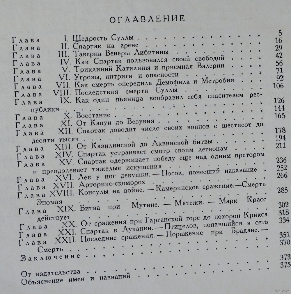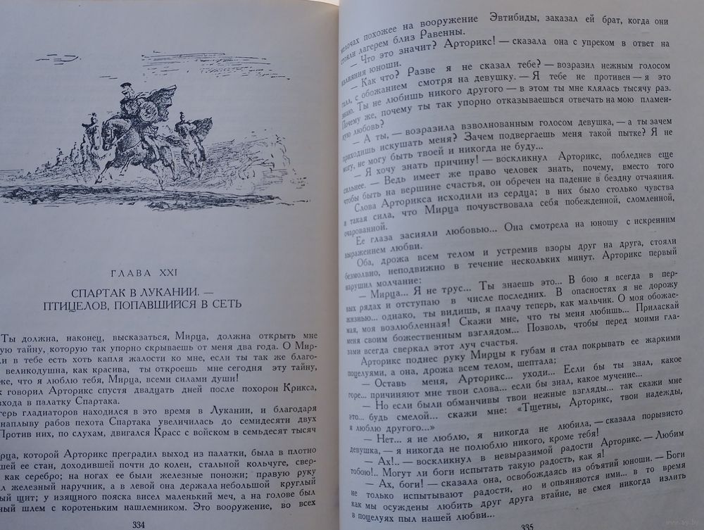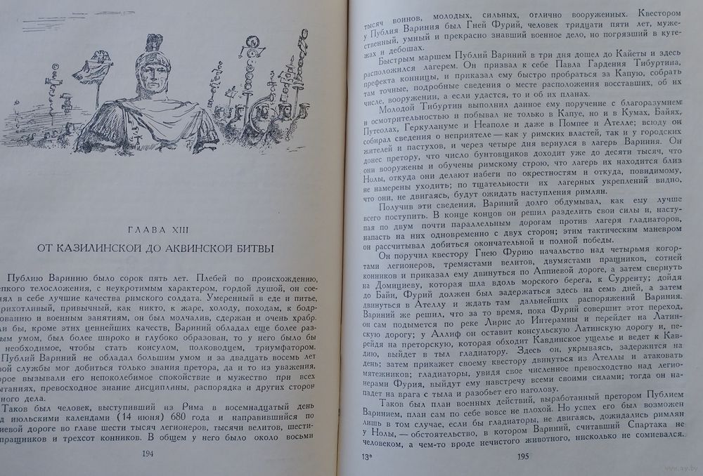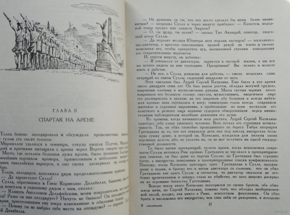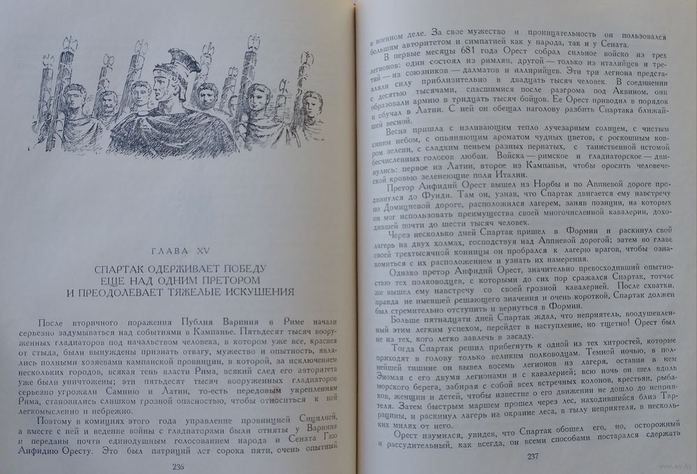Большой энциклопедический формат. 398 стр. Древний Рим первого века до нашей эры. На арене огромного цирка идет жестокий и страшный бой гладиаторов. Вот упал раненным один из противников, и победитель смотрит на зрителей, чтобы узнать их волю. Свыше девяноста тысяч мужчин, женщин и детей опустили большой палец правой руки книзу: это был знак смерти, и меньше пятнадцати тысяч добросердечных людей подняли руку, сжав ее в кулак и подогнув большой палец,—в знак того, что побежденному гладиатору даруется жизнь. Здесь, на окровавленной арене цирка знакомится читатель с героем романа — фракийцем Спартаком Чужеземный воин, он был взят римлянами в плен и обращен в раба-гладиатора. В книге показано, как свободолюбивый, человечный, мужественный Спартак поднимает гладиаторов на восстание, цель которого— уничтожение рабства. Автор рассказывает о военных подвигах и хитростях Спартака и его друзей, рисует грандиозные картины сражений, стремительные переходы и полные тревожного ожидания бивуаки. В романе обрисованы быт и нравы античного общества, выведены многие исторические деятели Древнего Рима: Сулла, Юлий Цезарь, Цицерон, Марк Красс и др.